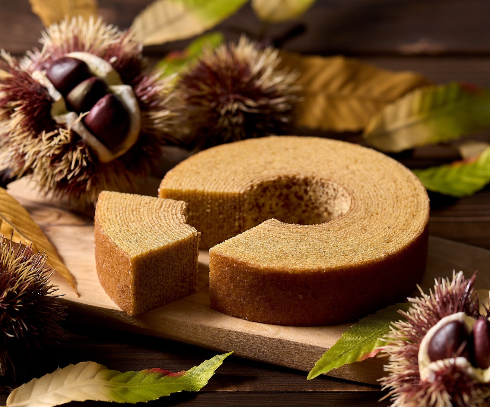 国産和栗のマロンペーストを2種類ブレンドした秋の新商品「和栗バウムクーヘン」。片方のマロンペーストには渋皮付きを使用し、程よい控えめな甘さで芳醇な味わいに仕上げました。周りにかけたフォンダンにはラム酒をアクセントに使用。トースターなどで少し温めると、栗ならではの香ばしい風味がより感じられます。