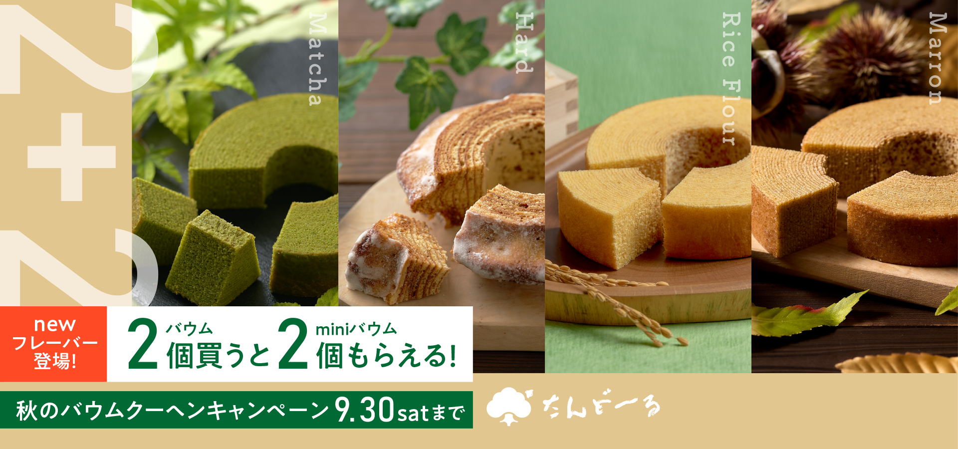 対象商品:たんど~るの和栗バウムクーヘン/たんど~るの抹茶バウム/たんど~るのハードバウム アーモンド/龍の瞳 米粉バウムクーヘン/たんど~るのバウムS、L、LL/その他、ホールのバウムクーヘンが入ったセット商品も対象です。