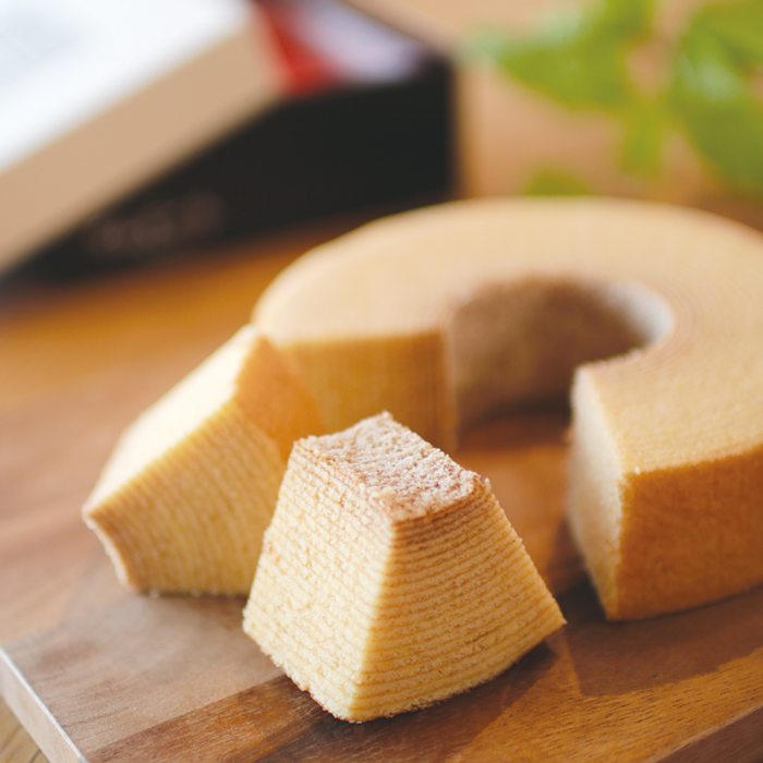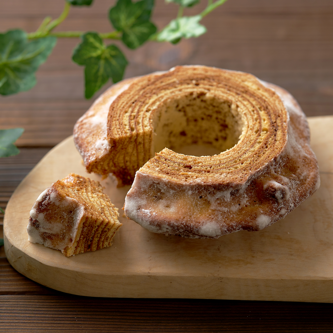岐阜県産卵、北海道産バター・生クリームを使用した、たんど~るを代表するバウムクーヘンです。手作りで一層一層丁寧に焼き上げることで、しっとり・ふんわりしながらも、バウムクーヘンらしい層を感じられる食感に仕上げています。
