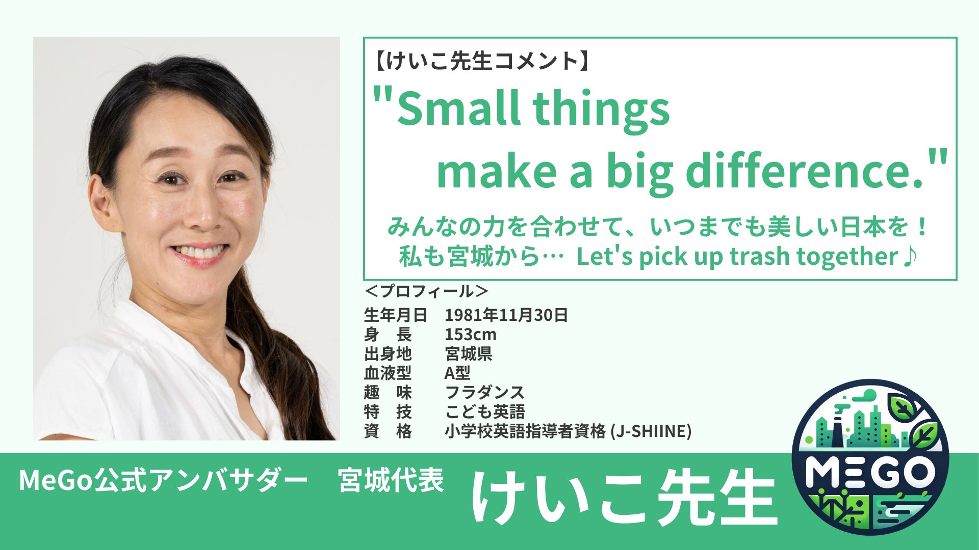 けいこ先生は、オンラインレッスン/オンライン保育「NannyME」の人気英会話講師です。宮城で生まれ育ち、現在も3姉妹ママをしながら宮城で英語を教えています。このたび、自身にゆかりのある宮城のクリーン活動を盛り上げるべく、「MeGo」(ミーゴー)の公式アンバサダーに就任いたしました。