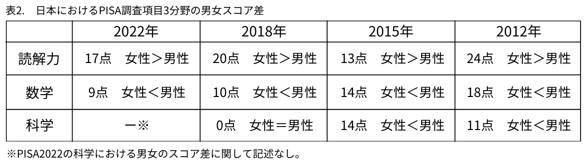 PISA2015において、男女の学業成績差は生まれつきの能力差ではなく、教育制度の改善で縮小可能と示唆(*2)あり。