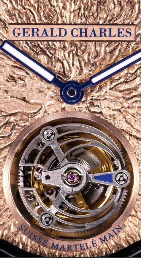 オクタビオ・ガルシアがデザインしたチタン製のジェラルド・チャールズ専用のトゥールビヨンケージ。ジェラルド・チャールズのロゴを表現。アイコニックなGCブルーのGスモールストロークが秒針の役割。