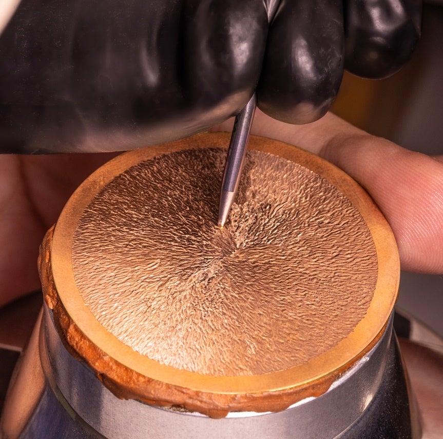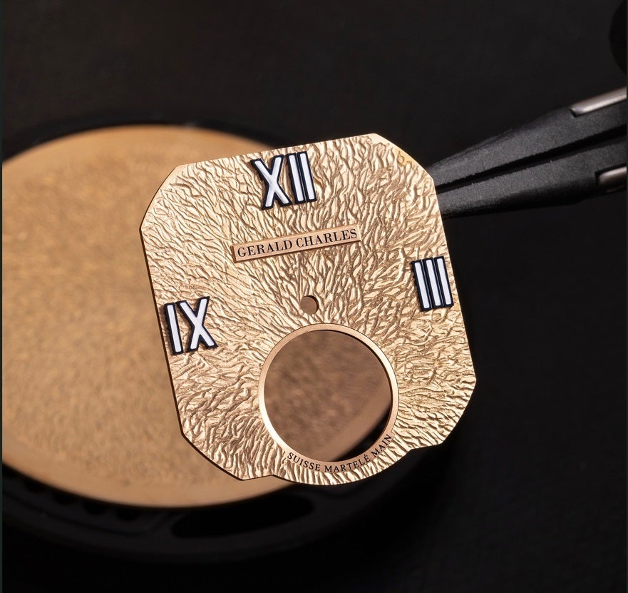ローマン トゥールビヨンは、コーティングを施していない18Kローズゴールドの文字盤が高級感を際立たせています。手作業で鎚目仕上げを施したゴールド文字盤の技術を習得するには、繊細な職人技と総合的な経験が必要でした。文字盤のクラフツマンシップ、耐久性のバランスを取ること、そして一貫した仕上げパターンを再現することは、ジェラルド・チャールズの研究開発チームが直面した課題のほんの一部にすぎません。