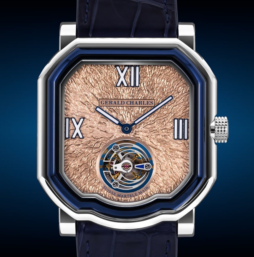 マエストロ9.0ローマン トゥールビヨンは、ジェラルド・チャールズのオリジナルモデルであり、初めて手作業で鎚目仕上げを施したゴールド文字盤、初めて採用された2トーンカラーと2種類の素材、そして現在のコアコレクションで初めて採用された、新型フォールディングクラスプ付き手縫いブルーアリゲーターストラップが特徴です。