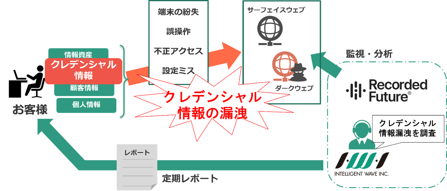 ダークウェブなどへ漏洩したクレデンシャル情報を悪用した不正アクセスを防止するために、インターネット上に漏洩しているドメインに紐づくクレデンシャル情報を調査・報告します。