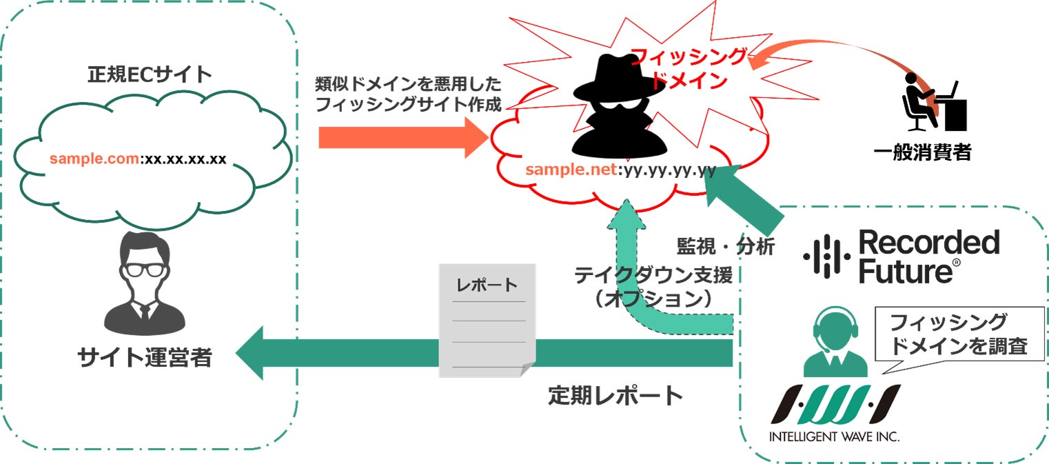 正規のサービスドメインの類似ドメインを悪用し、顧客情報やマルウェア配布などを行うフィッシングサイトを検知し、報告します。