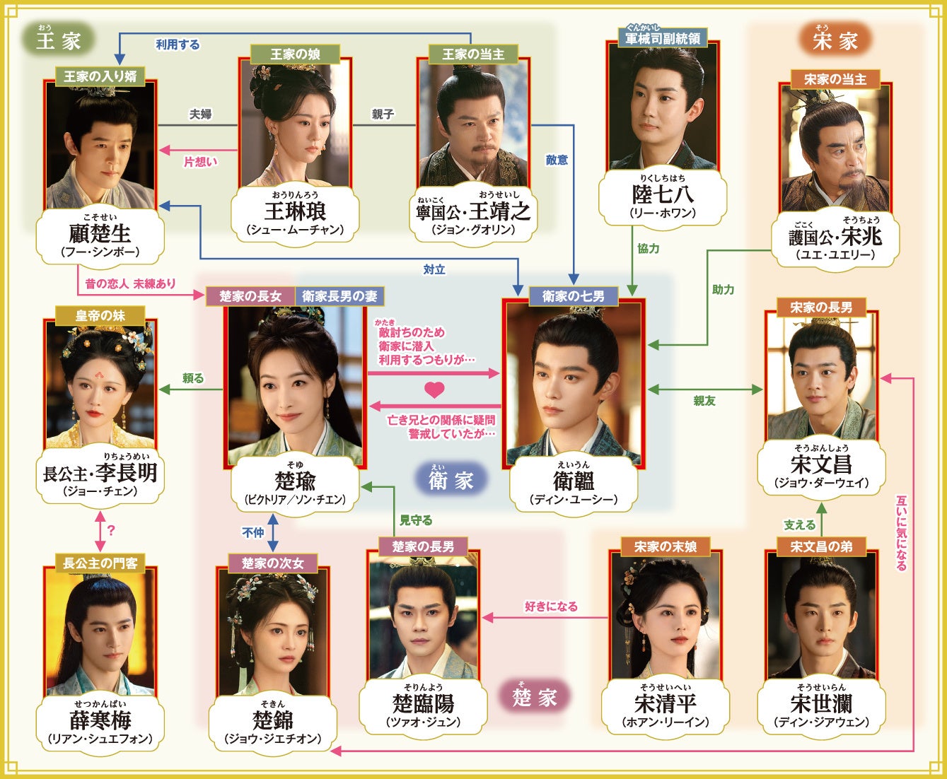 「祈今朝<ききんちょう>〜失われた記憶、共鳴する愛~」のフー・シンボーが複雑な想いで楚瑜を見守るかつての恋人役で穏やかながら迫力ある存在感を見せ、「独孤皇后~乱世に咲く花~」のジョー・チェンが難解なキャラクターの長公主役を貫禄たっぷりに熱演。「青雲伝~惹かれ合う二人、許されぬ愛~」のリアン・シュエフォンがキーマンとなる長公主の門客に扮し、その謎めいた美しさが強い印象を残す。また、夢や志を持ちながらもそれぞれの立場で葛藤を抱えるキャラクターたちを「無憂渡~瞳に映った真実の愛~」ツァオ・ジュン、「有翡(ゆうひ)-Legend of Love-」ジョウ・ジエチオン、「星より輝く君へ」ジョウ・ダーウェイ、「子夜帰」ホアン・リーインらが好演! 彼らの生き生きとしたアンサンブルと、中国時代劇ファンには顔なじみのベテラン勢による熟練の演技が融合しドラマをより一層魅力的に盛り上げる!