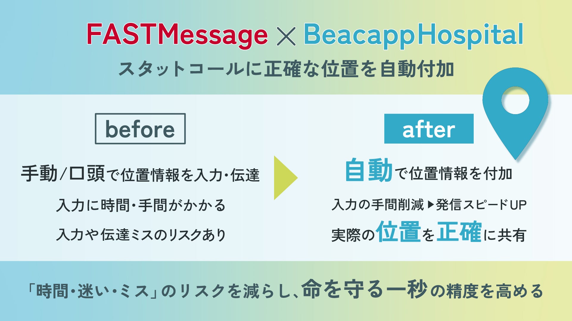 株式会社チェンジホールディングス(本社:東京都港区、代表取締役兼執行役員社長:福留 大士、以下「チェンジHD」)の子会社である、屋内位置情報サービス累計導入社数No.1(※1)の「Beacapp Here」を提供する株式会社ビーキャップ(本社:東京都港区、代表取締役社長:岡村 正太、以下「ビーキャップ」)は本日、ビーキャップの病院向けリアルタイム可視化ツール「Beacapp Here Hospital」において、リード株式会社(本社:群馬県前橋市、代表取締役社長:塚越 智和、以下「リード」)が開発・提供する一斉通知システム「FASTMessage」との連携を開始しました。これにより、医療現場でスタットコール(緊急呼び出し)が発生した際、その発生場所をリアルタイムに特定できるようになり、迅速かつ確実な初動対応を支援します。