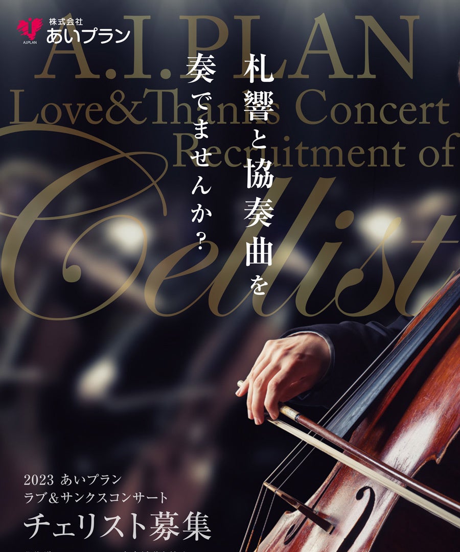 株式会社あいプラン(北海道札幌市・代表取締役・新道喜信)が毎年主催している、『ラブ&サンクスコンサート』で札幌交響楽団と共演していただけるチェリストを募集。応募資格は北海道在住、2023年9月20日(水)札幌コンサートホールKitaraでのコンサートにご参加いただける方。応募は2022年10月31日(月)まで。