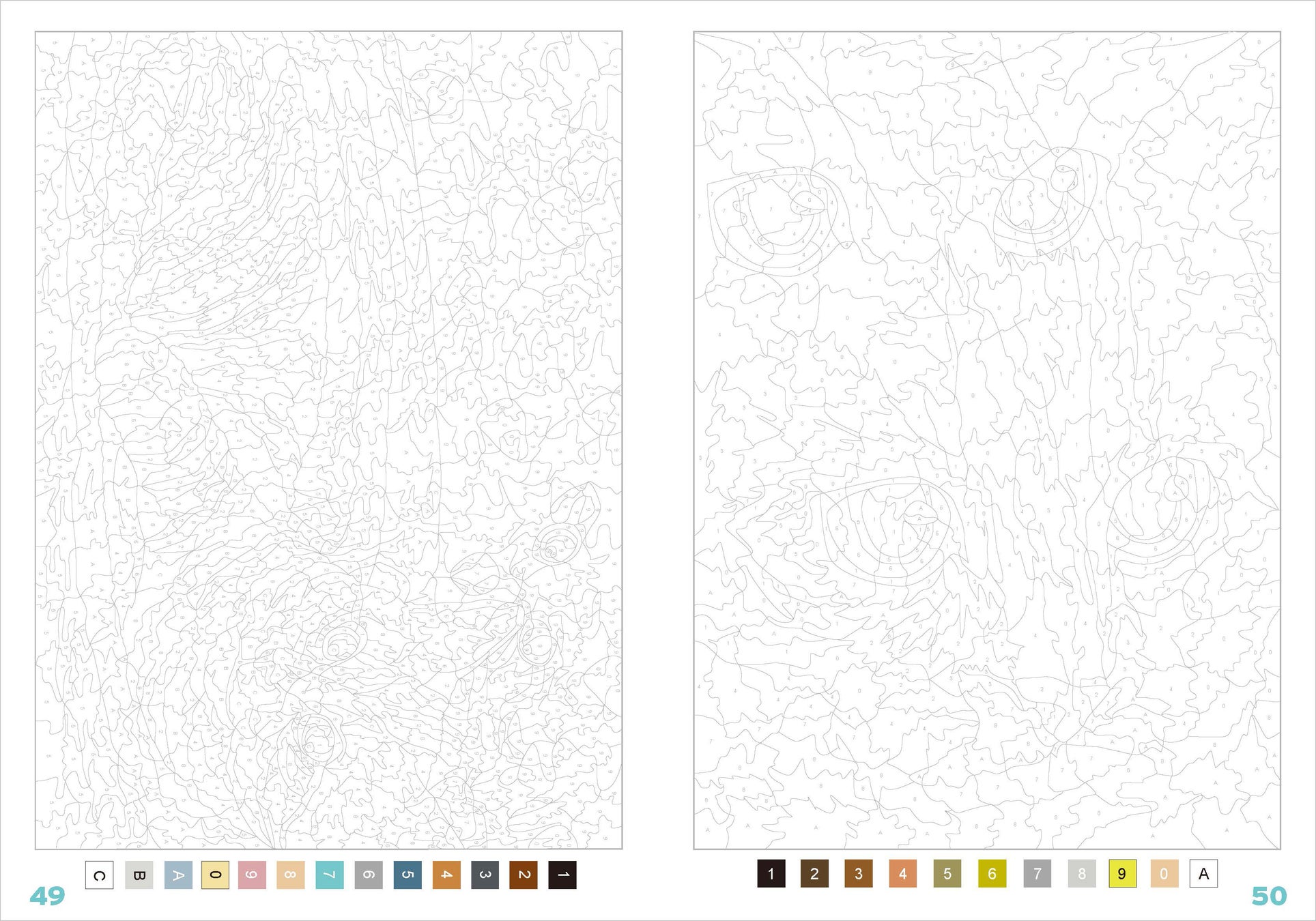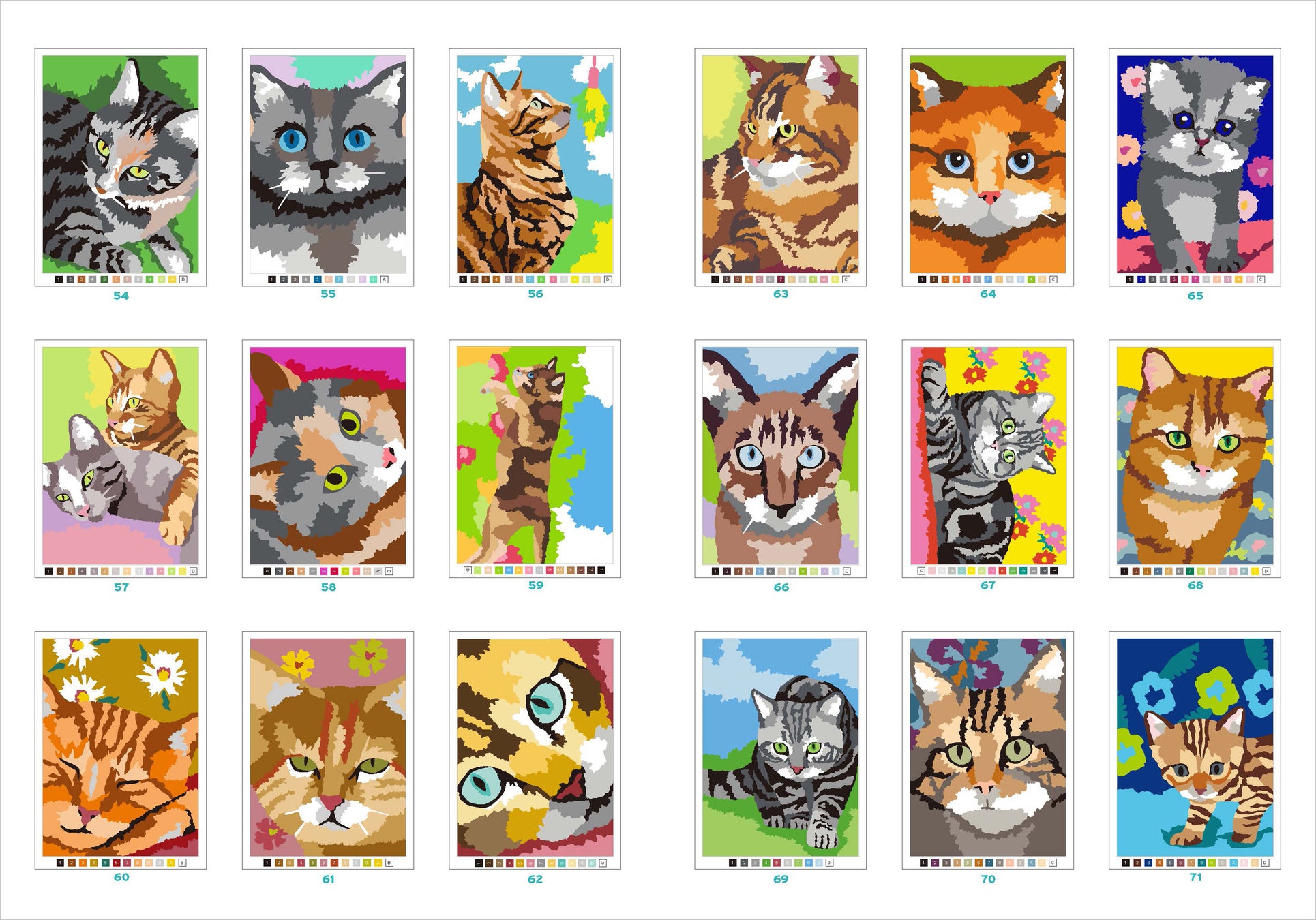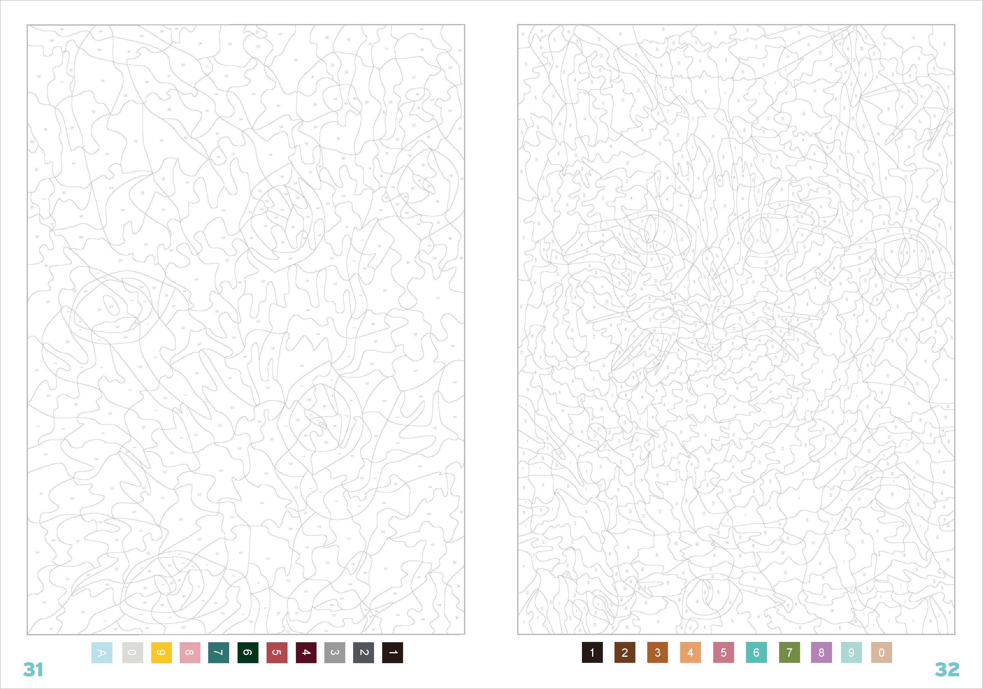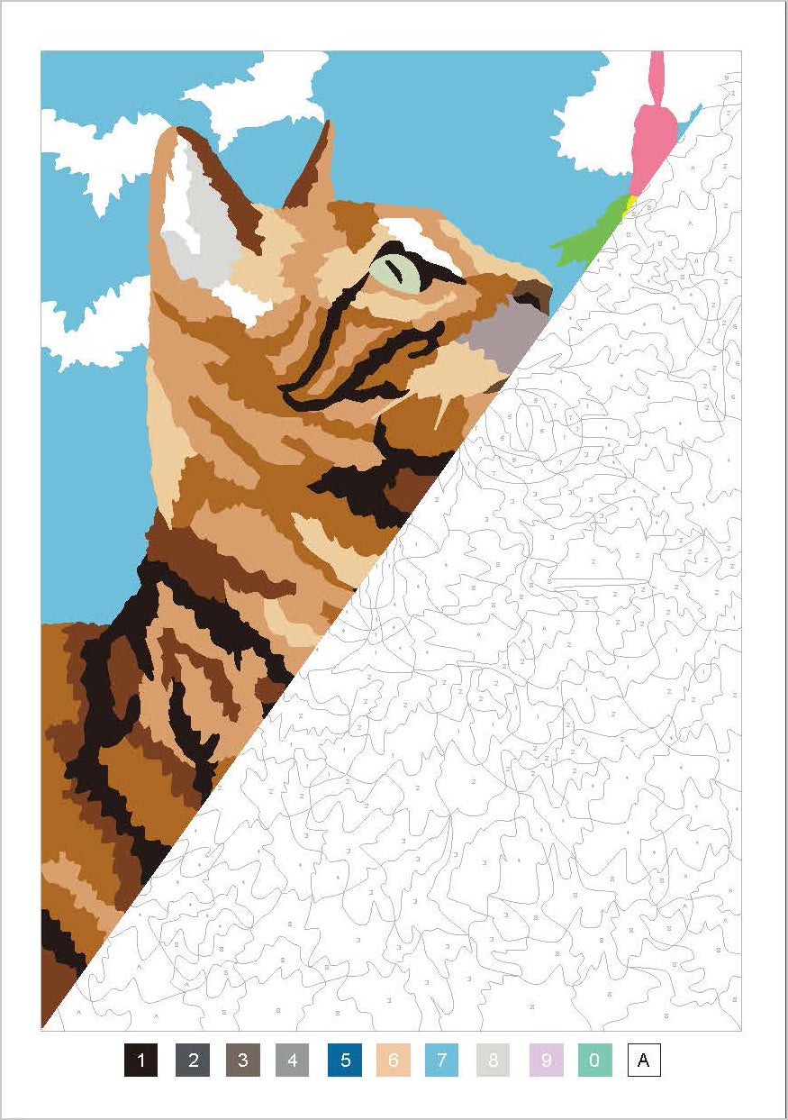 ぎっしり並んだピースのどこに猫が隠れているのかしら? 塗る前のピースを眺めてもまったくわかりません。夢中で塗り進めていくうちに、かわいらしい猫たちが浮き上がってきます!