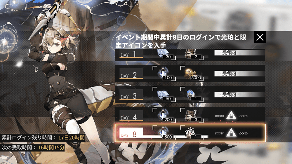 イベント期間中、期間限定でログインボーナスが配布されます。指定条件を達成すると専用のログイン報酬がもらえます。