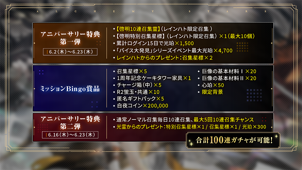 1周年記念イベントの期間中、ゲームにログインすると【啓明10連召集霊】(特別限定召集【啓明の光】10回召集に使用)、光珀×1500(最大)、1周年記念限定フレーム【1周年記念リング】、大量の育成材料などの豪華報酬を獲得できます。