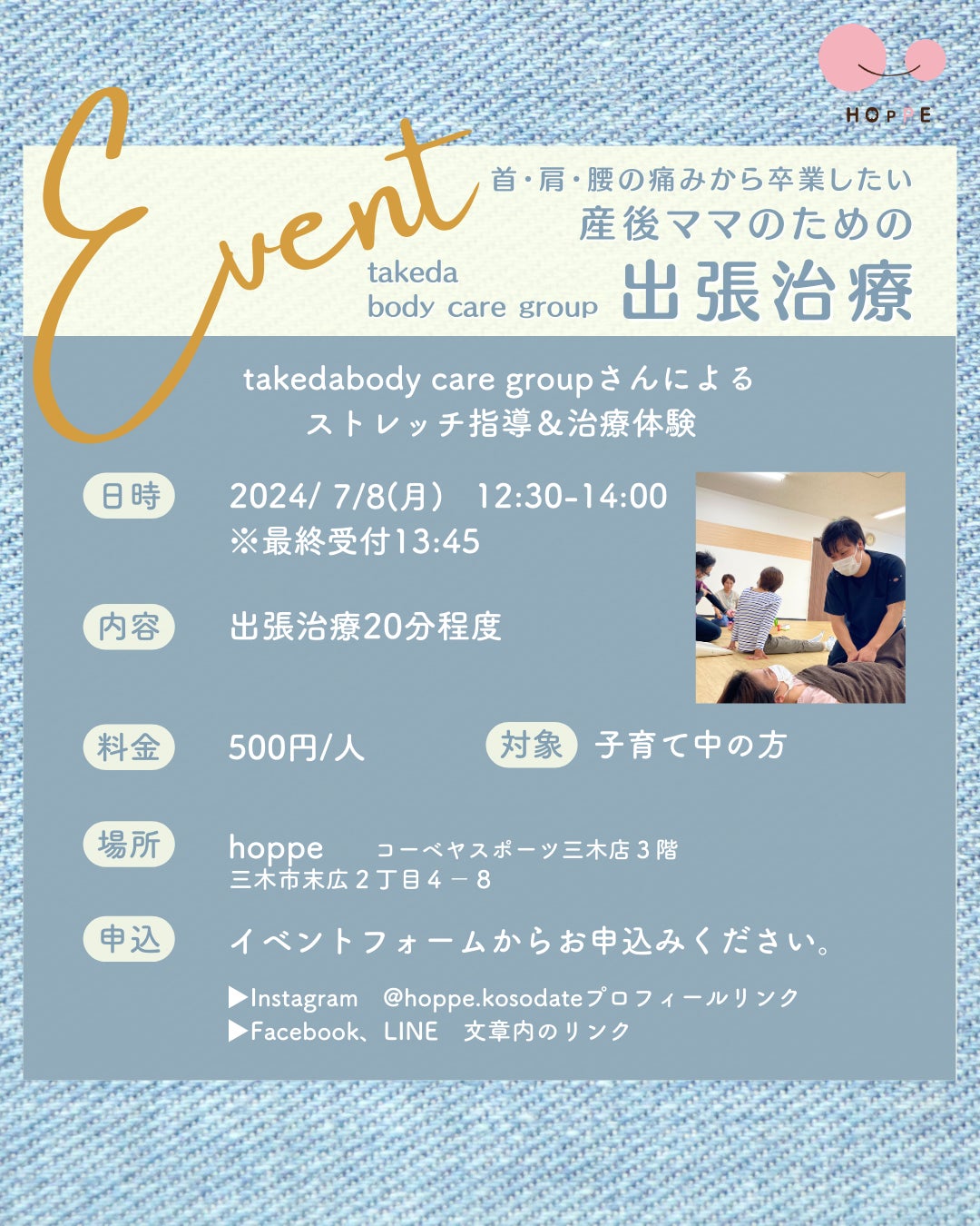 特定非営利活動法人ほっぺ(代表:大森 奈津子)は、takedabody care groupさんをお招きし、2024年7月8日(月)hoppe(コーベヤスポーツ三木店3階)にて、『産後ママのための出張治療』を開催いたします。