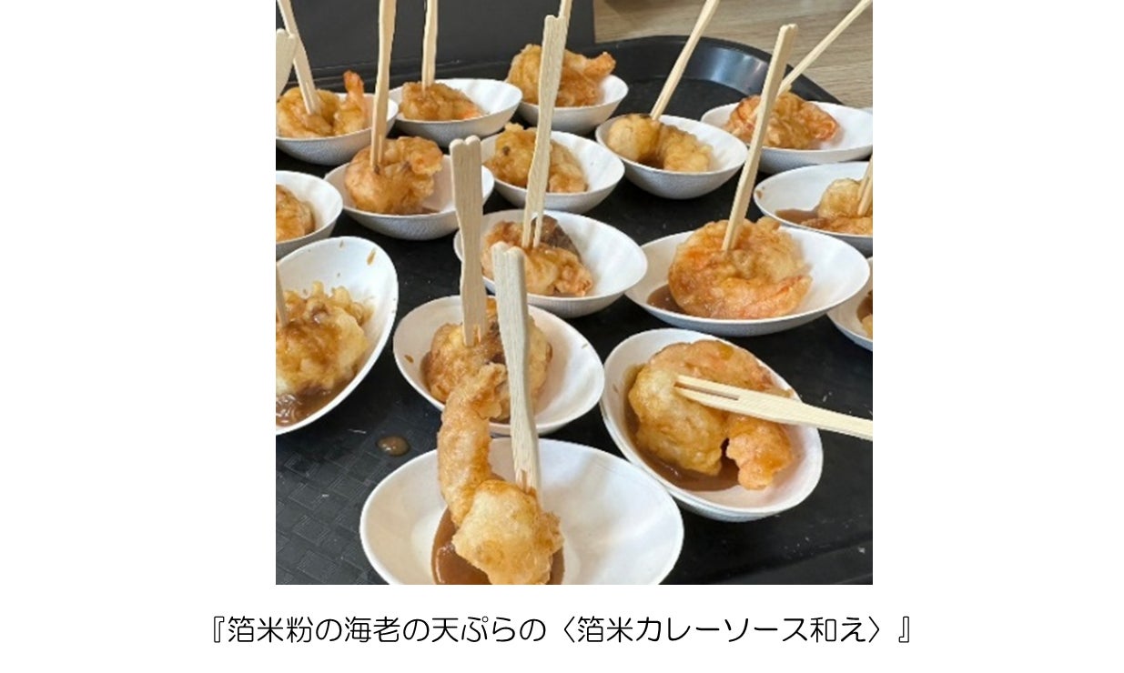 オーストラリアのメルボルンで開かれた『Osaka Food Business Showcase & B to B Meetings in Melbourne 主催 IBPC大阪』で『箔米粉』と『箔米カレー』のコラボメニュー『箔米粉の海老の天ぷらの〈箔米カレーソース和え〉』を提供しました。特徴としては天ぷらの粉には小麦粉ではなく、箔米粉を使用。オカキのように冷めても美味しいサクサク感が持続させ、海老の風味を閉じ込め提供することができました。さらに、鰹と昆布の和出汁ベースの箔米カレーをソースに使用することで、和出汁の香りがふんだんに味わえる商品が完成。海外のゲストにも喜んで、楽しんでいただけました。