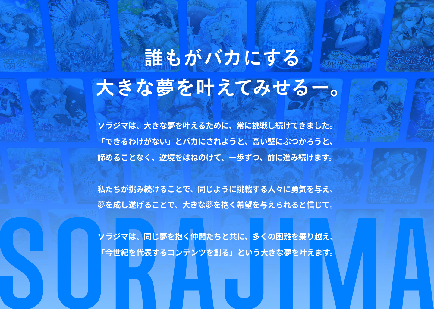 ソラジマが歴史にその名を刻むようなコンテンツを創造し、ログラインである「誰もがバカにする大きな夢を叶えてみせる」ことにさらに近づくために、私たちはコーポレートブランドの全面的な更新を決定いたしました。