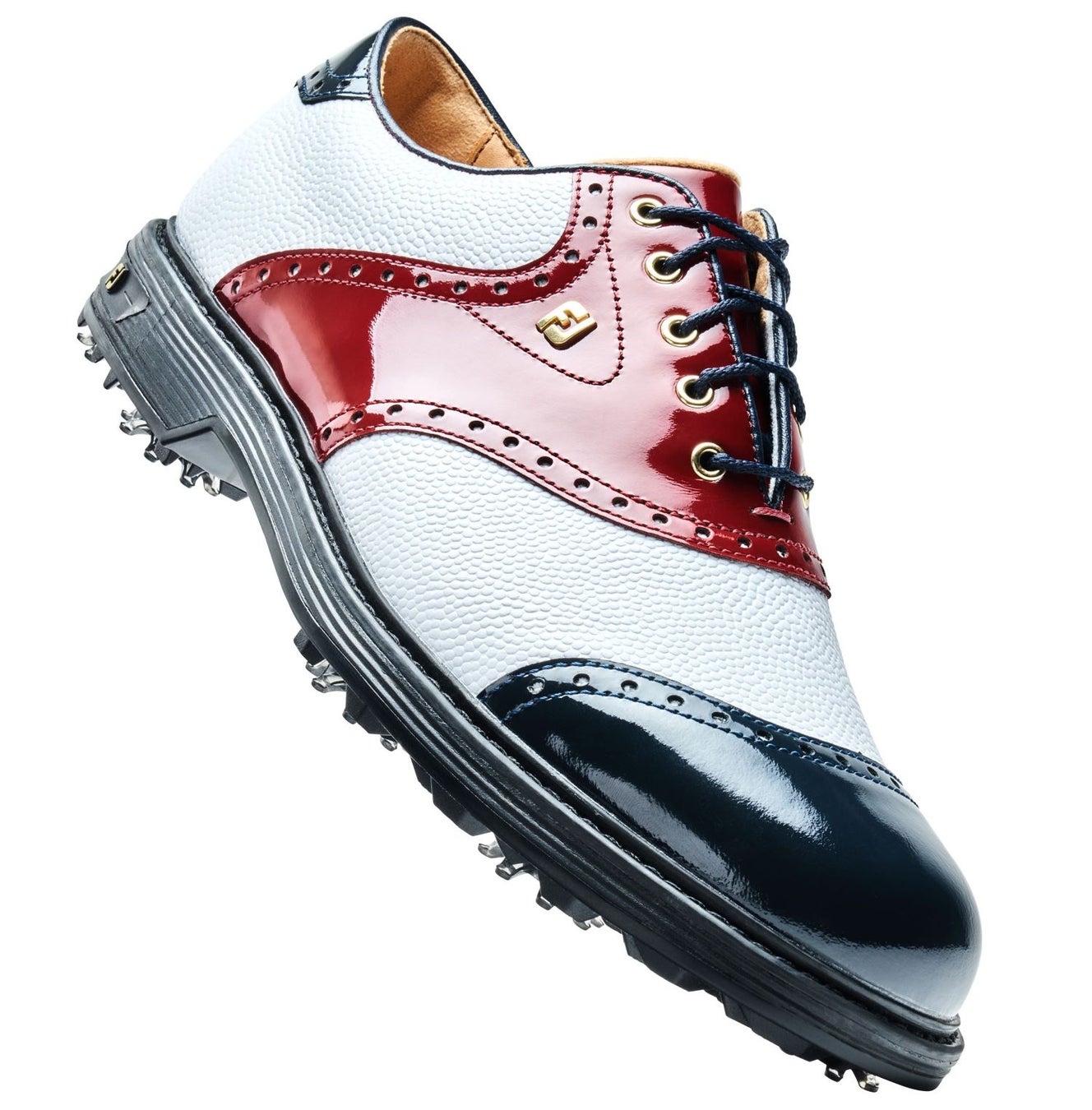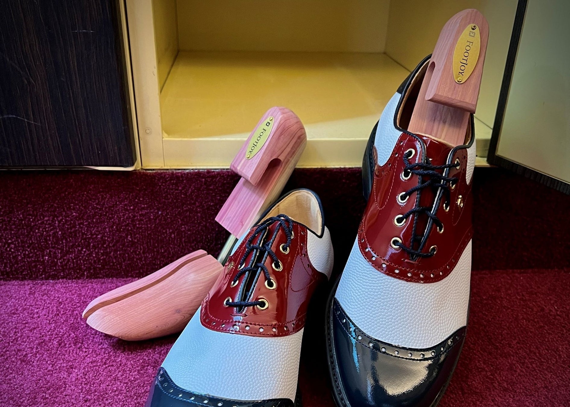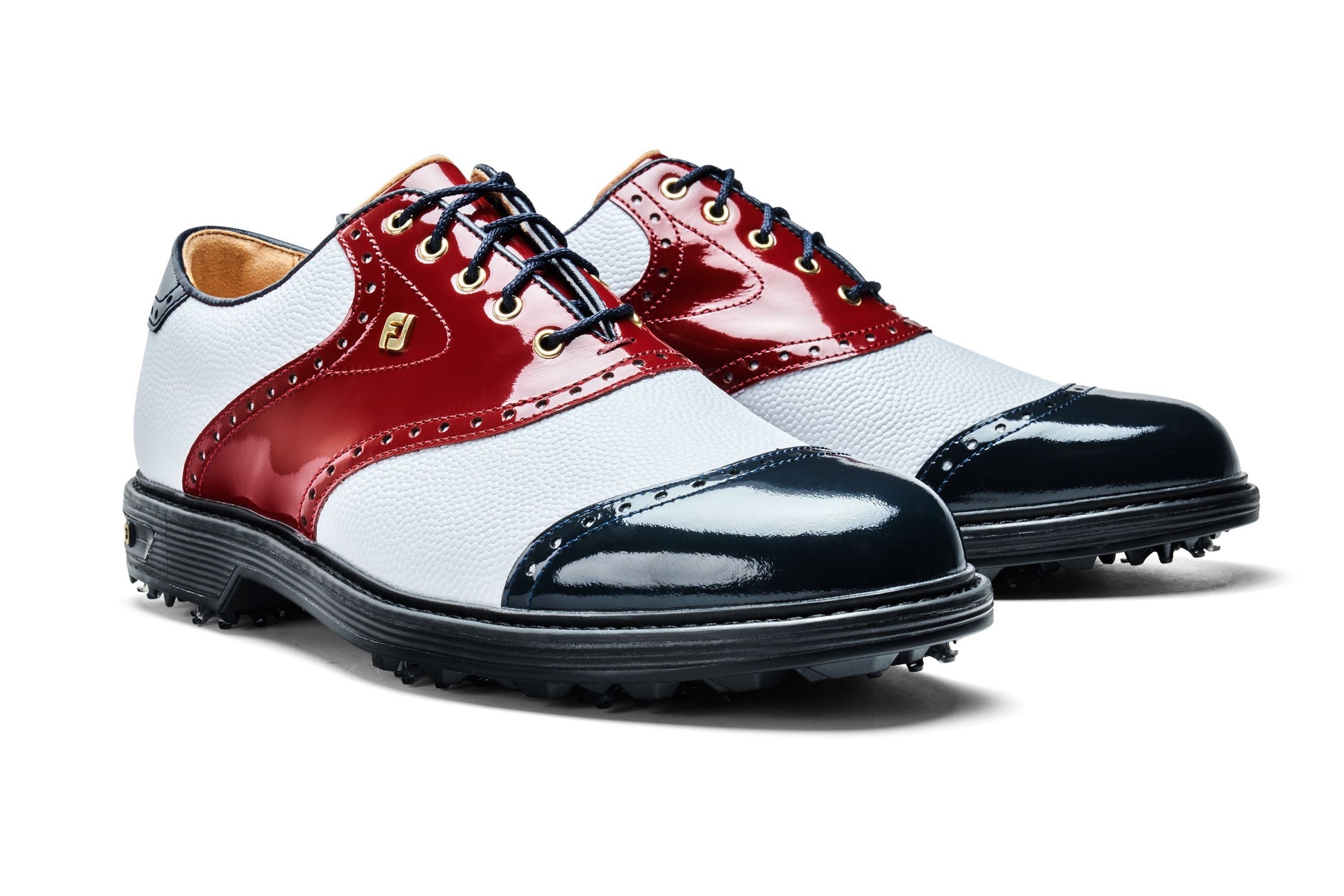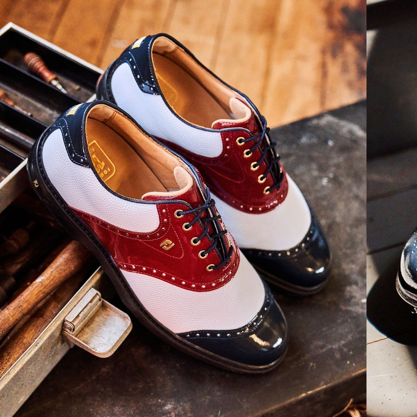 そんなフットジョイブランドの100周年記念モデルとして限定販売されるシューズは、ツアープロから絶大な支持を受け続けている「DRYJOYS PREMIERE Series」から、フットジョイの伝統的なデザインであるオリジナルサドルが施された「Wilcox」をベースにした特別な一足となっています。