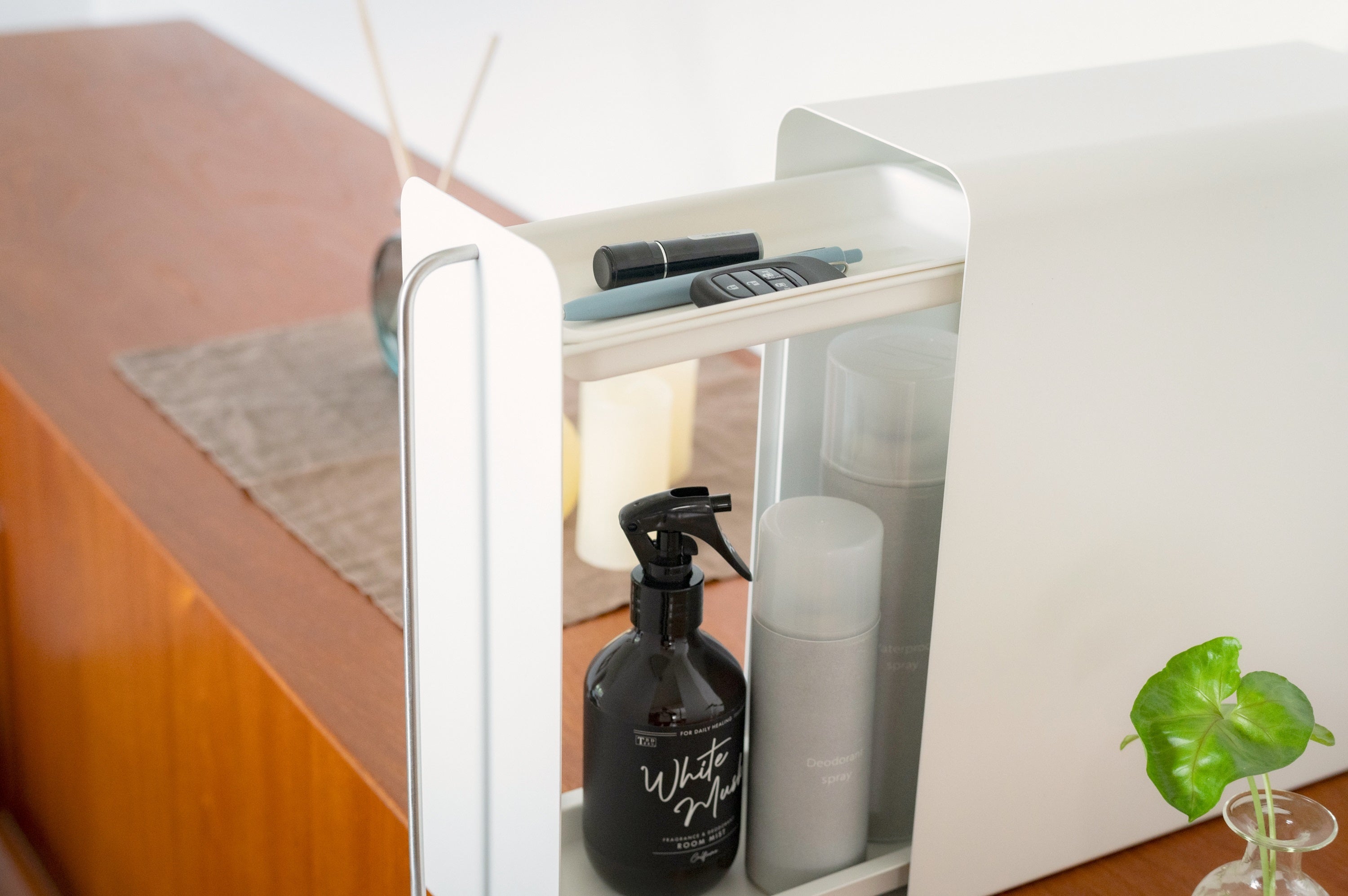 内部は2段式収納で、上段には鍵やハンコ、荷解きに使用するカッターなどの小物を収納。下段は高さのある除菌・消臭などのスプレー缶やボトル類を、すっきり収納できてサッと取りだせます。