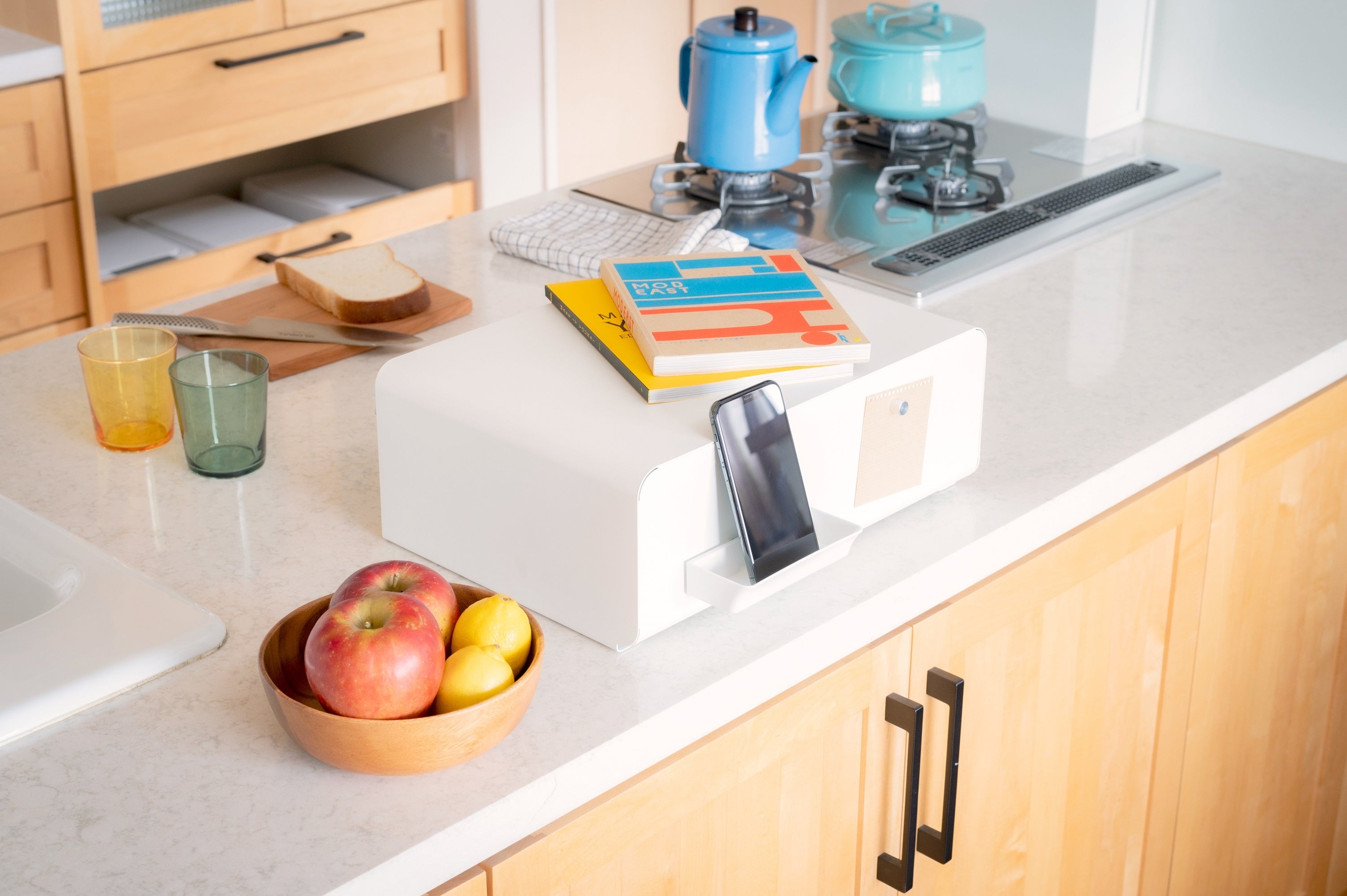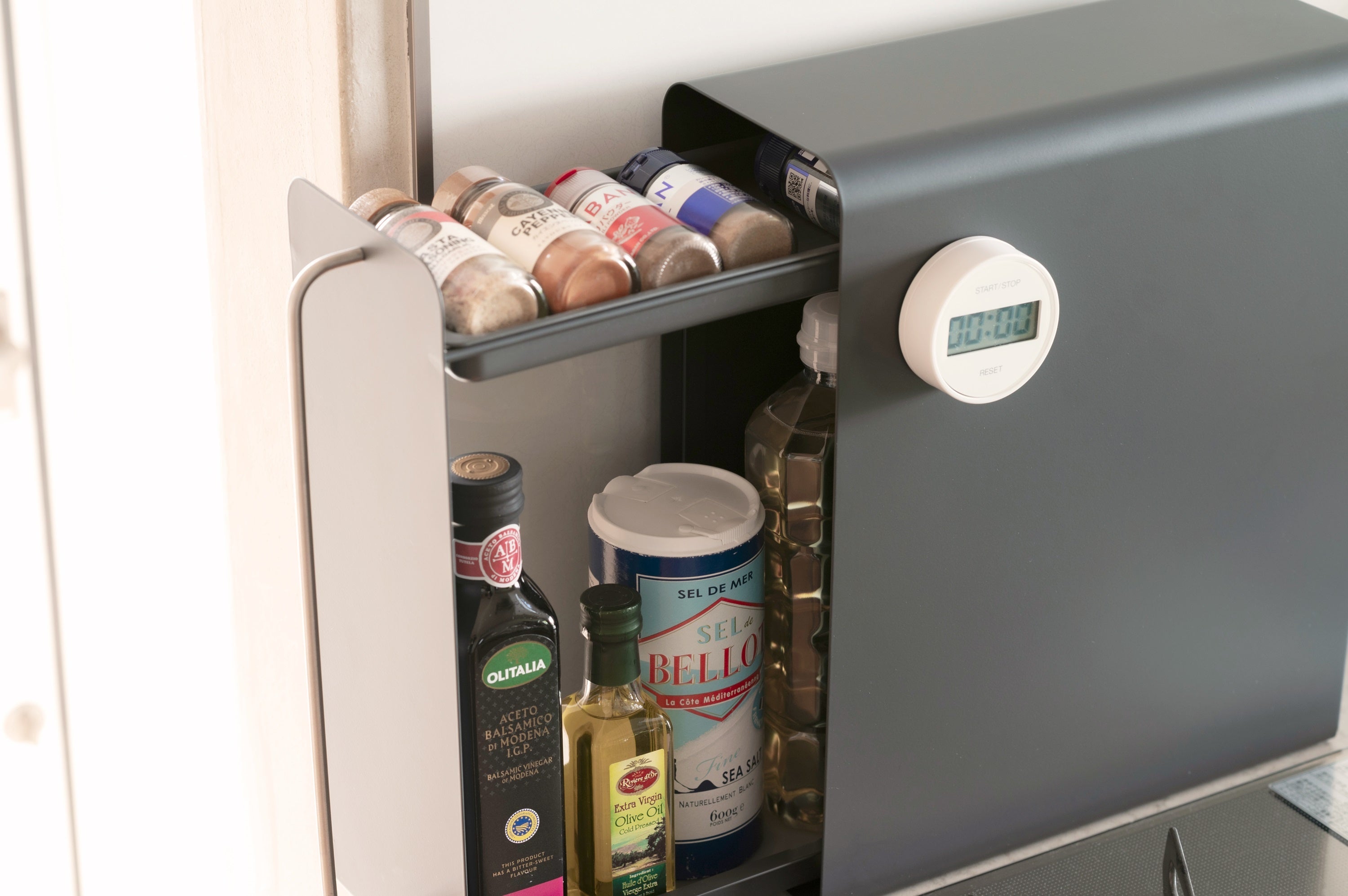 さらに、背面までこだわったスタイリッシュなデザインなので、両側から見えるカウンターに置いてもインテリアを邪魔しません。本体はマグネット対応なので、タイマーやフックを貼り付ければ、キッチン・リビングの両側からも役立ちます。