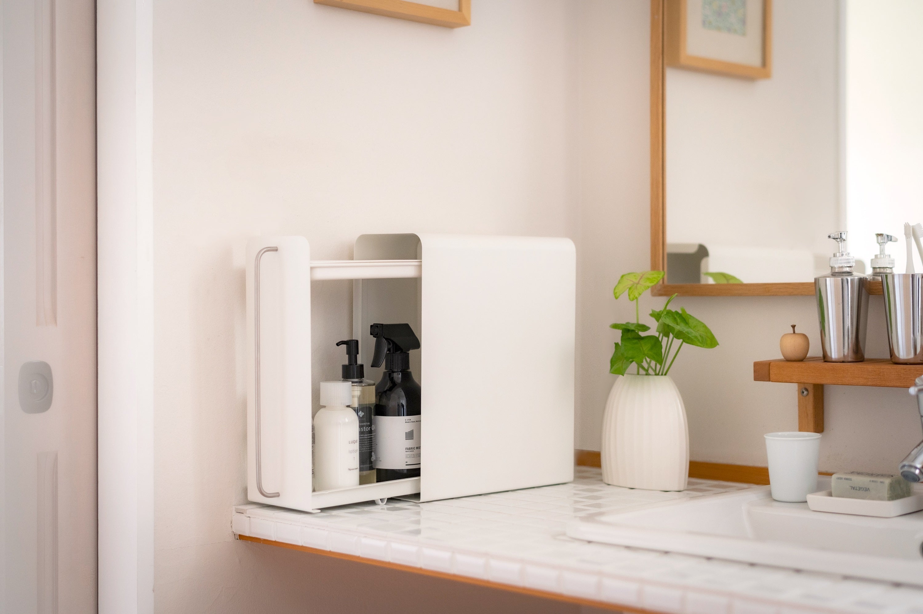 玄関に限らず、キッチンでの調味料入れや洗面台まわりの化粧水、ヘアスプレー入れ、リビングでの使用も。シンプルなデザインなので場所を選ばず自由にお使いいただけます。
