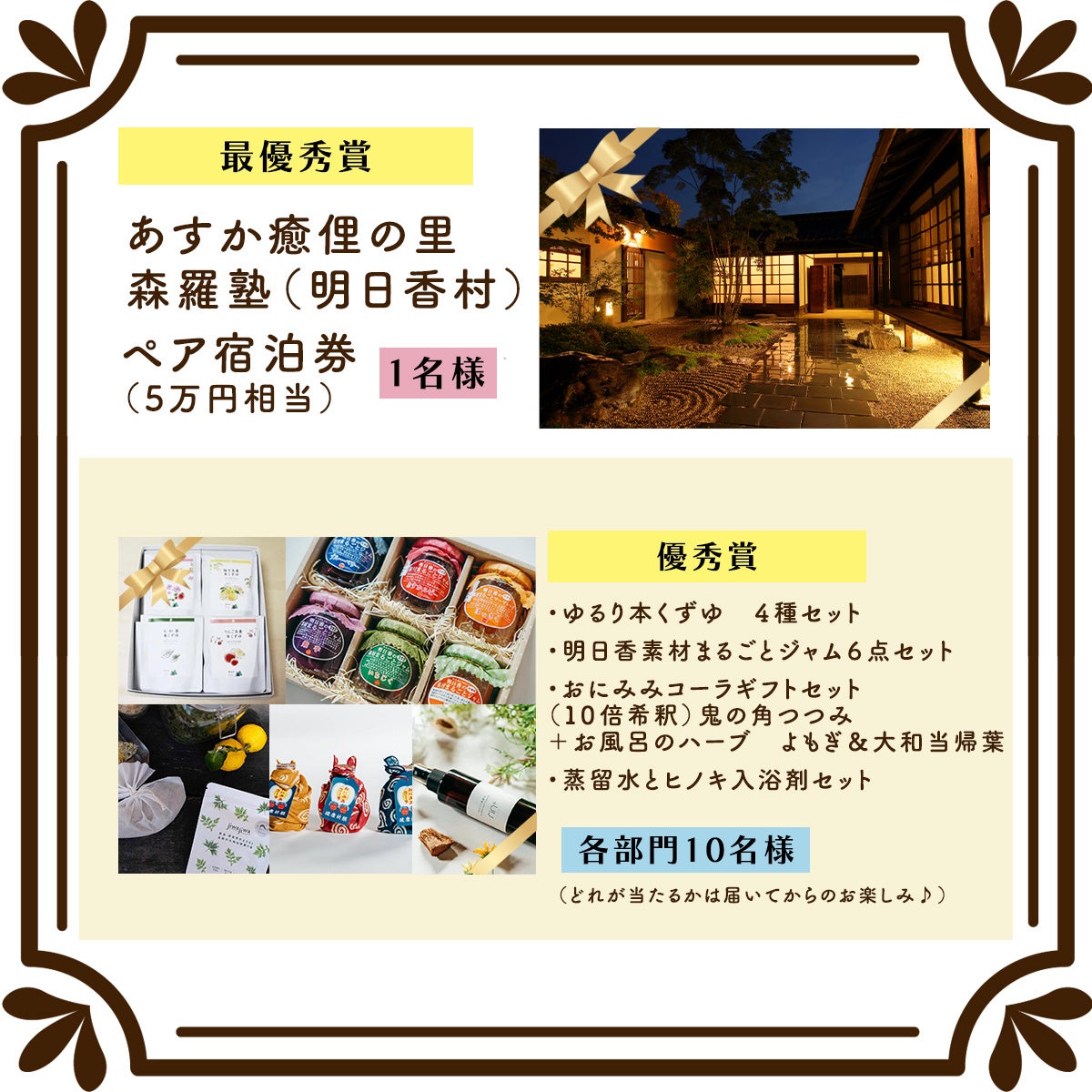 「知れば知るほど奈良はおもしろい」実行委員会が選んだ、最優秀賞【1名様】には、5万円相当の奈良県内のペア宿泊券をご用意、エリアごとに10名の優秀賞が選出され、計40名様に素敵な「奈良県の特産品詰め合わせ」をプレゼントします。さらに、入賞写真は、奈良県観光プロモーション(「知れば知るほど奈良はおもしろい」実行委員会事務局)の公式アカウント(@narakankopuromo)で掲載予定です。