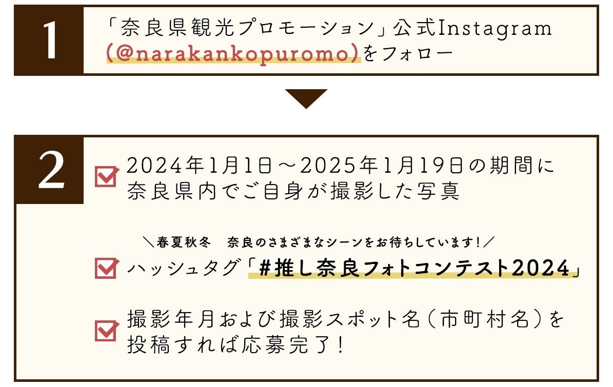 ※必ず奈良県観光プロモーション公式Instagramアカウント(@narakankopuromo)をフォローしてご応募ください。審査時にフォローを外されていると、審査の対象外となりますのでご注意ください。