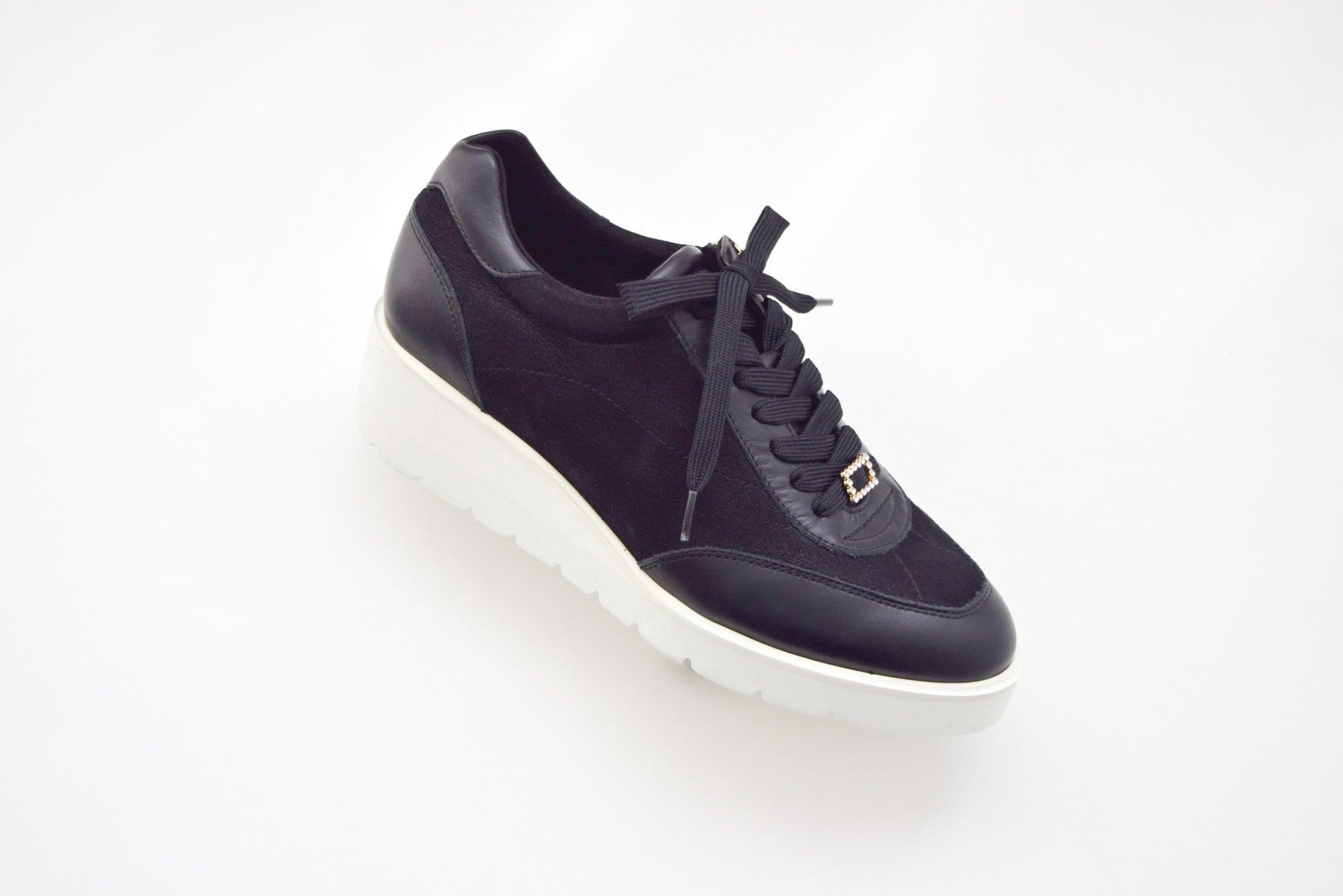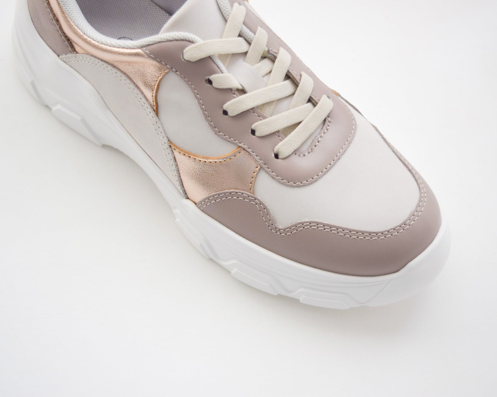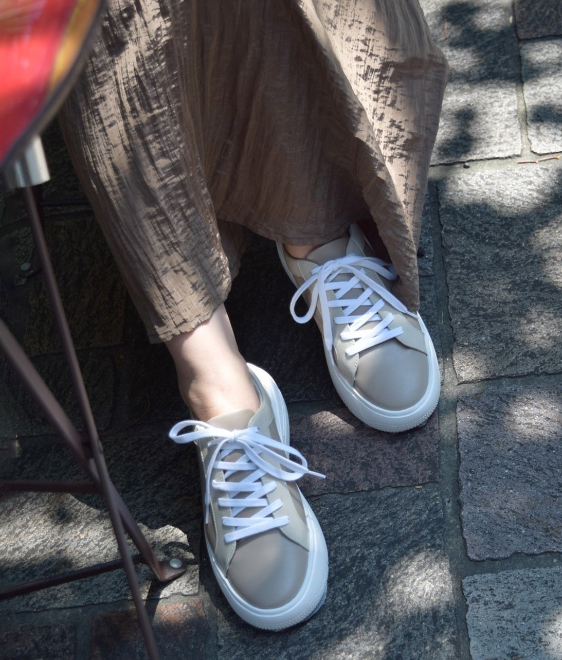 厚底ソールがポイントのスニーカー。 異素材MIXのデザインが足元にアクセントをプラス。