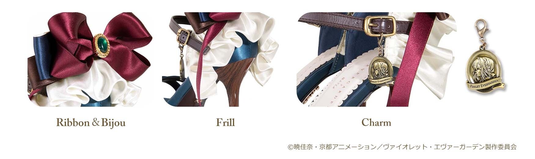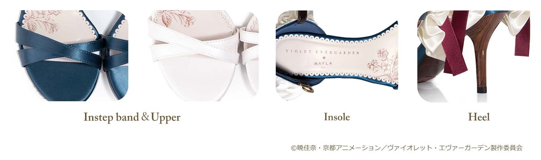 ヴァイオレットの姿を体現したかの様なカラー『Akora – アコラ - 』は、繊細な光沢を持つ高級サテン生地をベースに使用し、MAYLAオリジナルのアナザーカラー『Segen – ゼーゲン - 』は、上品な質感のパールホワイトレザー生地を使用しました。フリルカットのインソールには、タイアップロゴとすみれの花をプリント。艶やかなグロス加工を施した木目調ヒールはアンティーク感漂う仕上がりとなっています。