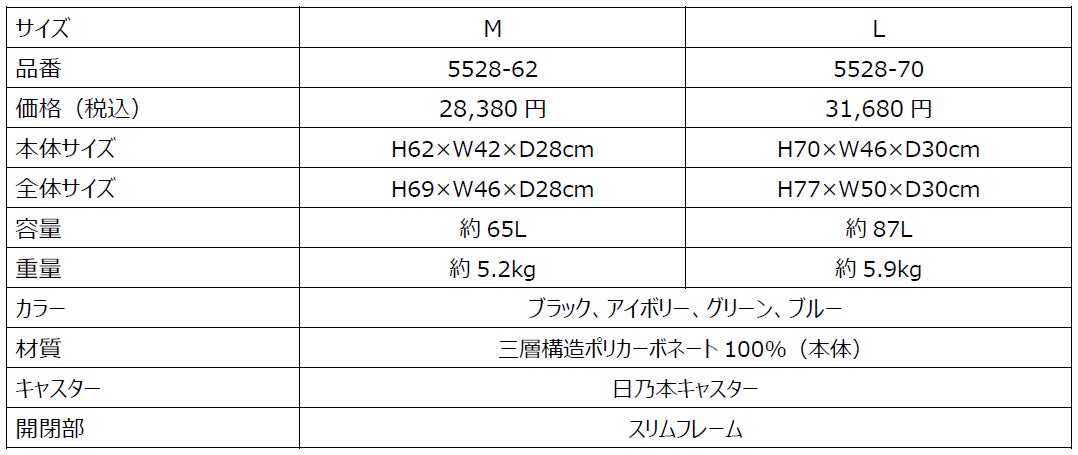 カラーはブラック、アイボリー、グリーン、ブルーの4色で、各色5~7泊程度対応のMサイズと7泊以上対応のLサイズの2サイズ展開。価格はMサイズが28,380円、Lサイズが31,680円(いずれも税込)です。旅先での出会いや体験とともに、日本文化の美意識を携えて帰る――そうした現代の旅にふさわしい一台です。