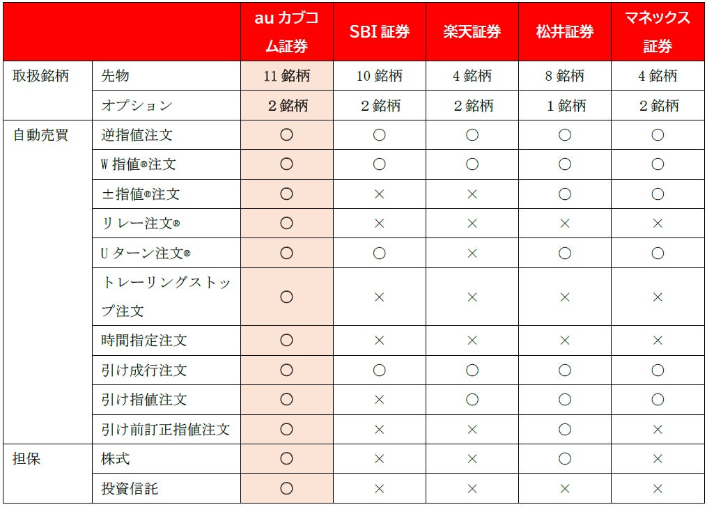 auカブコム証券の先物・オプションの取扱銘柄数は主要ネット証券最多(※)となります。また、従来からある自動売買の各種サポート機能に加え、証拠金の担保に投資信託もご利用いただけることが特長となります。