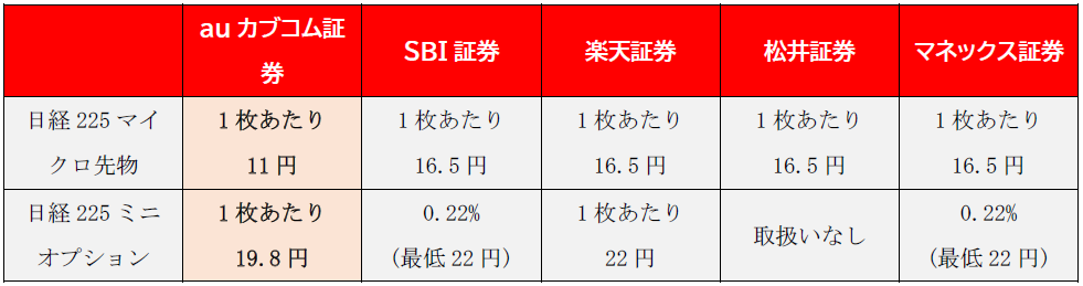 auカブコム証券では日経225マイクロ先物・日経225ミニオプションを主要ネット証券最低水準の手数料でお取り扱いいたします。いずれも約定枚数に応じた定額制の手数料体系としました。