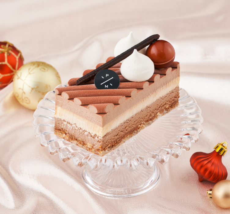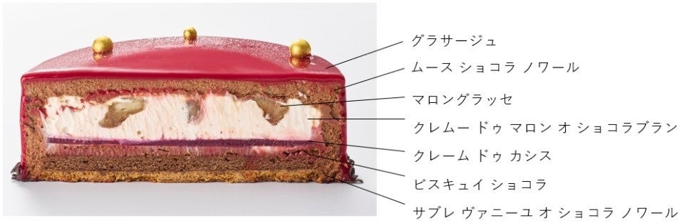 鮮やかな赤いグラサージュの中には濃厚なビターチョコレートムース。マロンの甘さとカシスの酸味のハーモニー、ビスキュイとサブレの食感も一度に楽しめる、ショコラティエかつパティシエであるピエール マルコリーニならではのケーキです。
