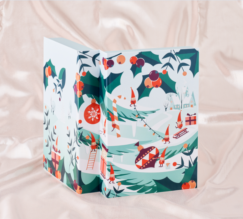 妖精たちがクリスマスの準備をしているパッケージの中には、小箱に入った24個のチョコレート。