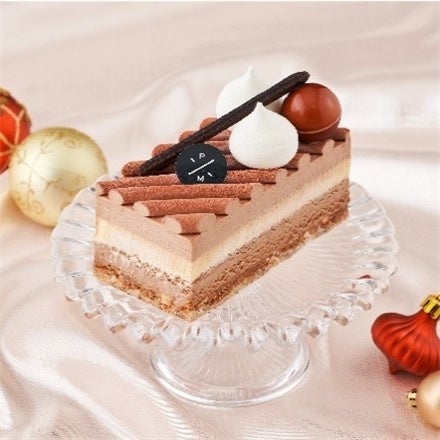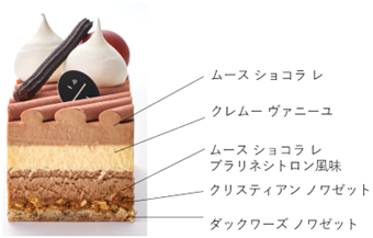 ピエール マルコリーニのオリジナルクーベルチュールを贅沢に使用。ショコラとバニラのムースに、さくさくとしたフィアンティーヌ、コクのあるダックワーズを合わせ、軽い触感のムースケーキに仕上げました。