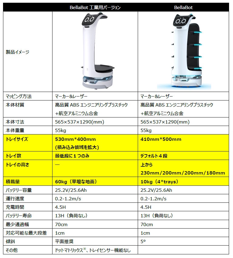 「BellaBot 工業用バージョン」は工場や倉庫などでのニーズに応えるため、「BellaBot」と比較し、トレイサイズ、トレイ数、積載量などにカスタマイズを加えています。