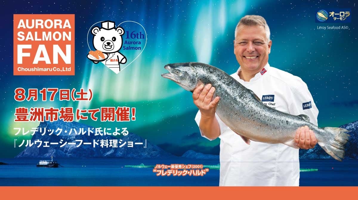 銚子丸は、2024年8月17日(土)、豊洲市場調理室において、オーロラサーモンの生産地ノルウェーからフレデリック・ハルドシェフを招いて、ノルウェーシーフード料理ショーを開催しました。