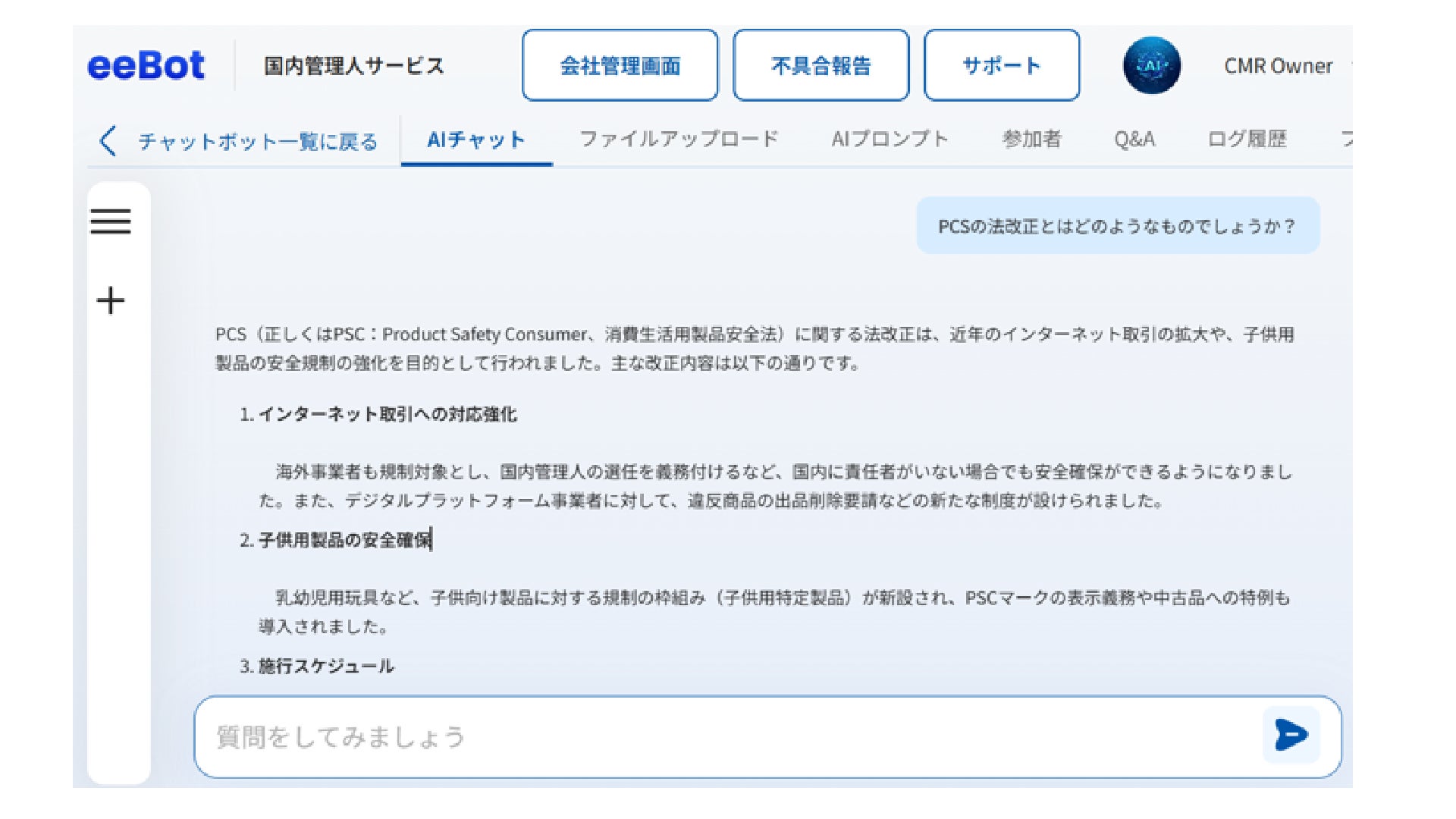 国内管理人クラウドの契約企業は、コマースロボティクスが自社開発した国内管理人AIチャットボット(AI RAG)を無料で利用できます。本チャットボットは、電気用品等の届け出書作成時に必要な区分判定についての質問や、関連法令に関する質問にも自動で回答します。