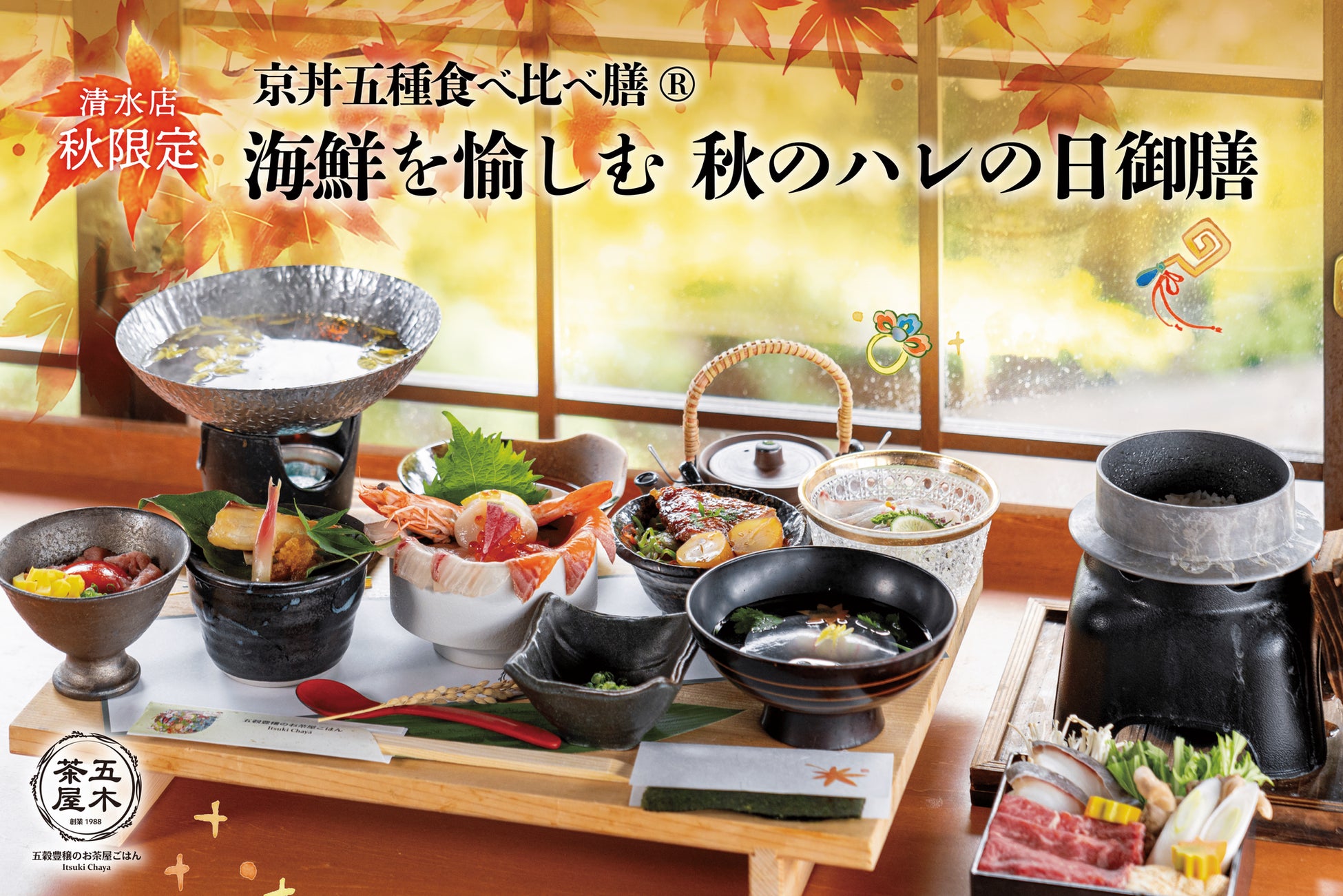 五穀豊穣のお茶屋ごはん®︎ 五木茶屋 清水店では、旬の海鮮を使用した【秋の京丼五種食べ比べ膳®︎】をご用意しました。秋の海鮮の旨味、美しい見た目を京町屋の空間でゆったりとお楽しみください。