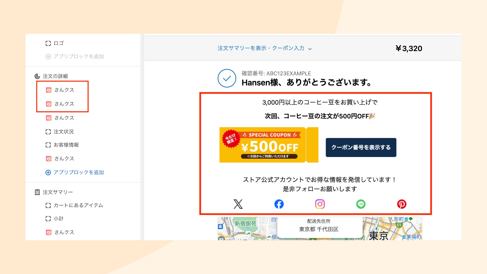 「さんクス」は、以下のカスタマイズが可能なアプリです。サンキューページを単なる購入完了の情報ページから、顧客との関係を深め、ストアの成長を促進するページへと変革することが可能になります。