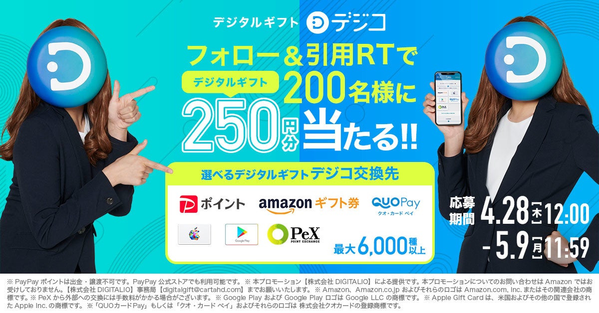 GW特別企画!デジタルギフト「デジコ」250円分が200名様に当たるTwitterキャンペーンを開始