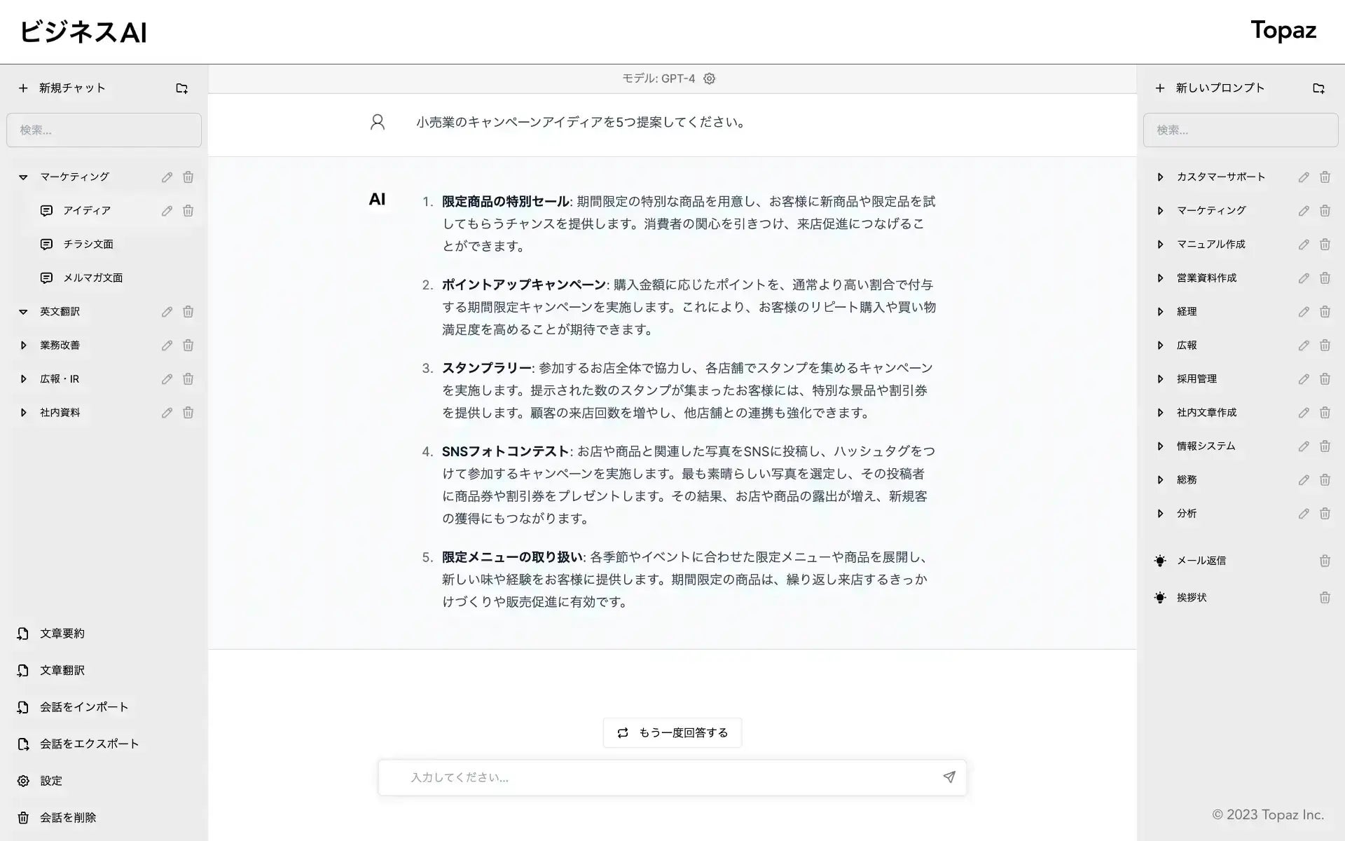 OpenAI社ChatGPT/GPT-4の他、日本初!8万文字対応のTopaz Pro AI、Google社Bard(PaLM 2)がご利用いただけます。