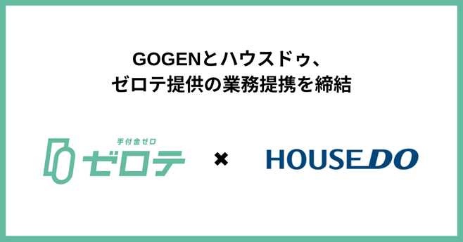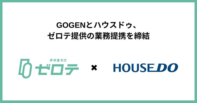 手付金が不要となる住宅購入支援サービス「ゼロテ」を開発・提供するGOGEN株式会社(本社︓東京都港区、代表取締役CEO︓和田浩明)は、ハウスドゥブランドで不動産事業を全国展開する株式会社And Doホールディングス(本社:東都千代田区、代表取締役:安藤正弘)の連結子会社である株式会社ハウスドゥ住宅販売(本社:東京都千代田区、代表取締役社長:冨永正英)と、「ゼロテ」の提供による両社の価値最大化を目指す業務提携契約を締結いたしましたのでお知らせいたします。