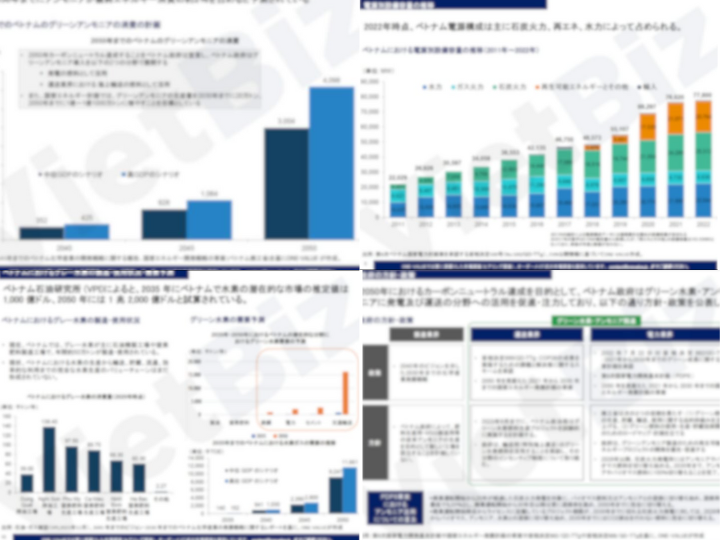 ベトナムにおけるグリーン・カーボンニュートラルの動向について、商工省、現地国営紙といった現地行政機関のほか、統計資料やデータを活用し、動向を記載。また、ONE-VALUE独自による政府機関、民間企業、業界団体へのヒアリング調査結果も記載