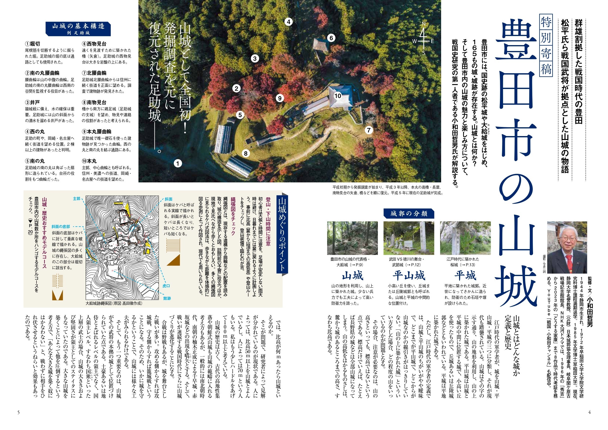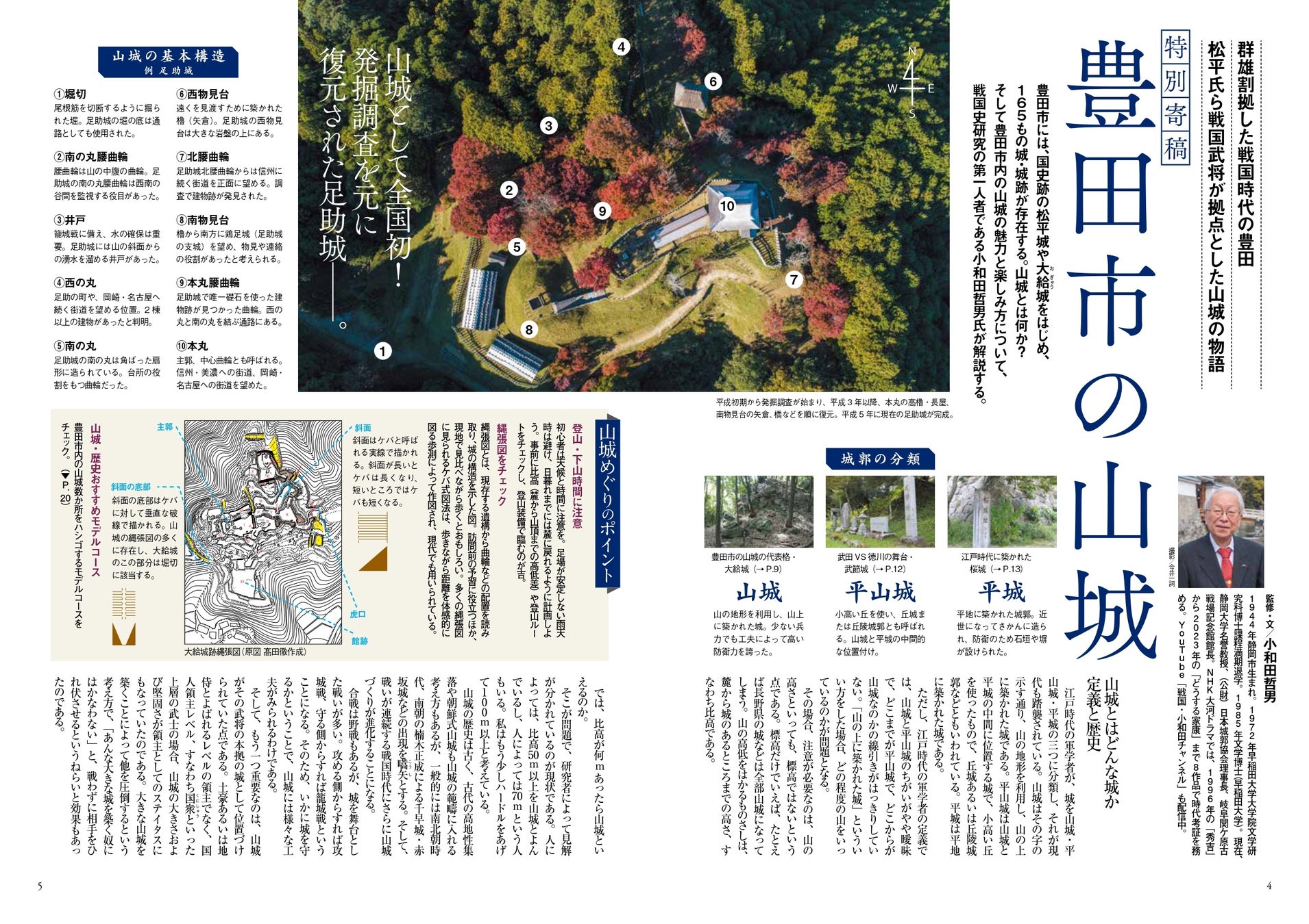 『とよた人』の執筆・監修には、月刊「歴史人」でもおなじみの著名な歴史学者である小和田泰経、藤井勝彦、本渡章、江宮隆之(いずれも敬称略・五十音順)といった、各時代のトップレベルの専門家が集結しました。また、巻頭特集には城郭研究の第一人者である歴史学者の小和田哲男氏が特別寄稿。山城の歴史や基本構造の解説、山城めぐりのポイントまで、豊田市の山城の魅力を堪能できる一冊になっています。
