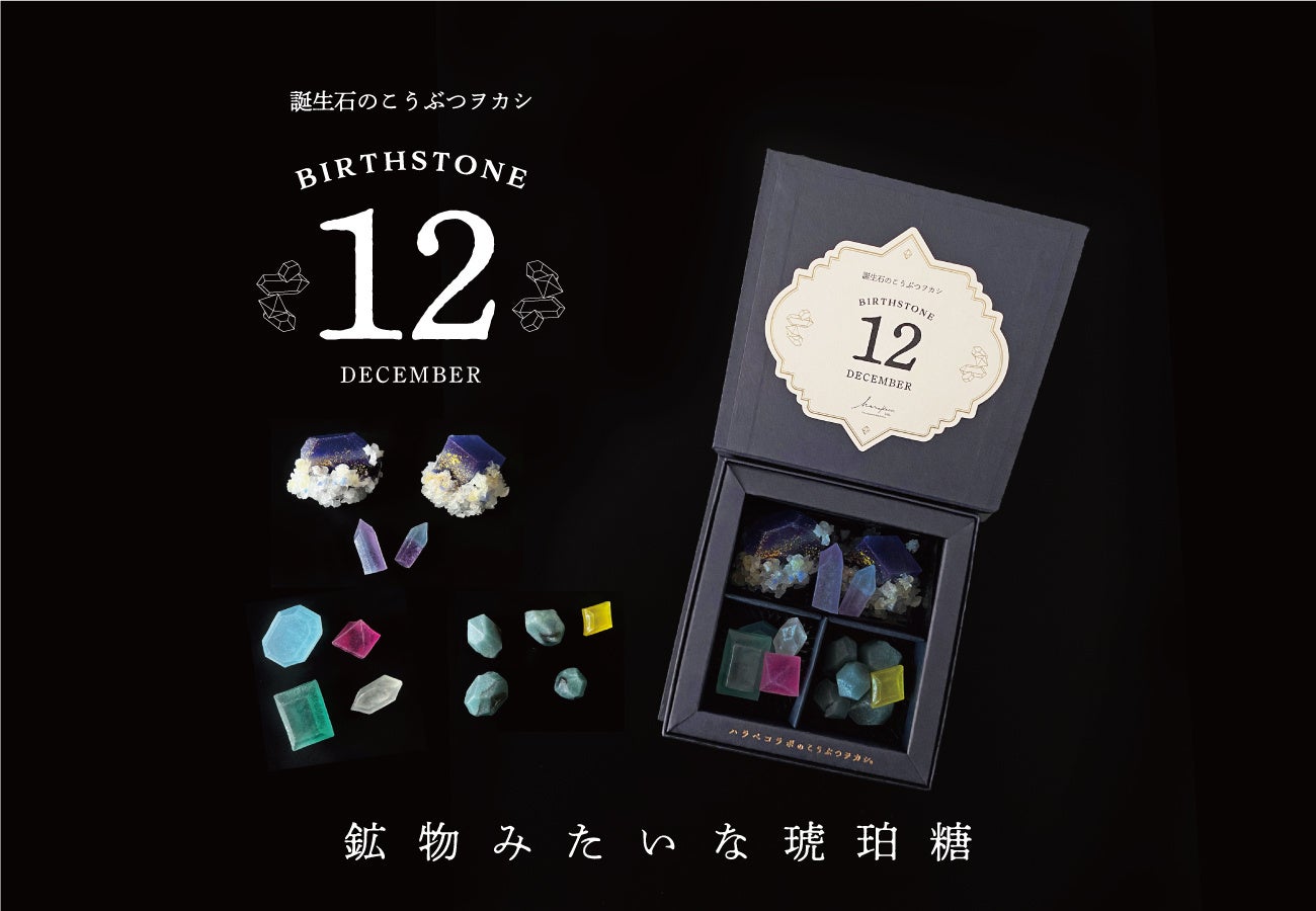 1ヶ月間限定で制作する琥珀糖こうぶつヲカシの人気の誕生石シリーズに、12月の誕生石が登場。天然由来の食用色素を用いた多彩な色彩と、小刀でひとつひとつ切り出す宝石のような形が魅力の寒天菓子。
