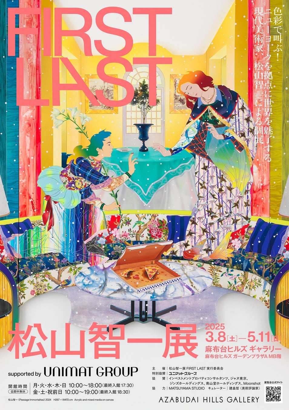 2025年3月8日(土)から5月11日(日)まで、ニューヨークを拠点にグローバルな活躍を見せるアーティスト松山智一の東京で初となる大規模個展「松山智一展 FIRST LAST」が、東京の新たなアートスポット・麻布台ヒルズ ギャラリーで開催されます。四半世紀にわたって現代アートの本場ニューヨークで活動し、いまや世界が注目する次世代のアーティストのひとりとなった松山の日本初公開となる大規模作品15点を含む、約40点が展示されます。さらに、展覧会タイトルにもなる、新シリーズ「First Last」を発表します。松山の特異なアイデンティティを通して捉えたグローバルな現代社会のリアリティを、迫力ある色彩と壮大なスケールの絵画で体感いただける展覧会です。