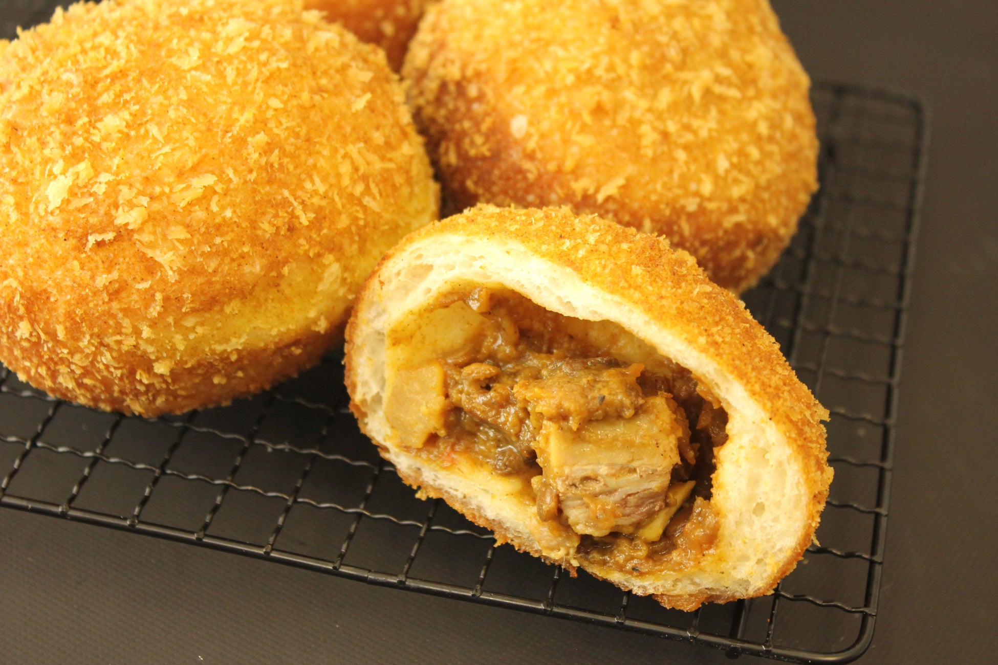 ごろっとした大きな牛肉とチーズを包んで揚げた、しっかりとお肉を楽しめる食べ応えのあるカレーパンです。