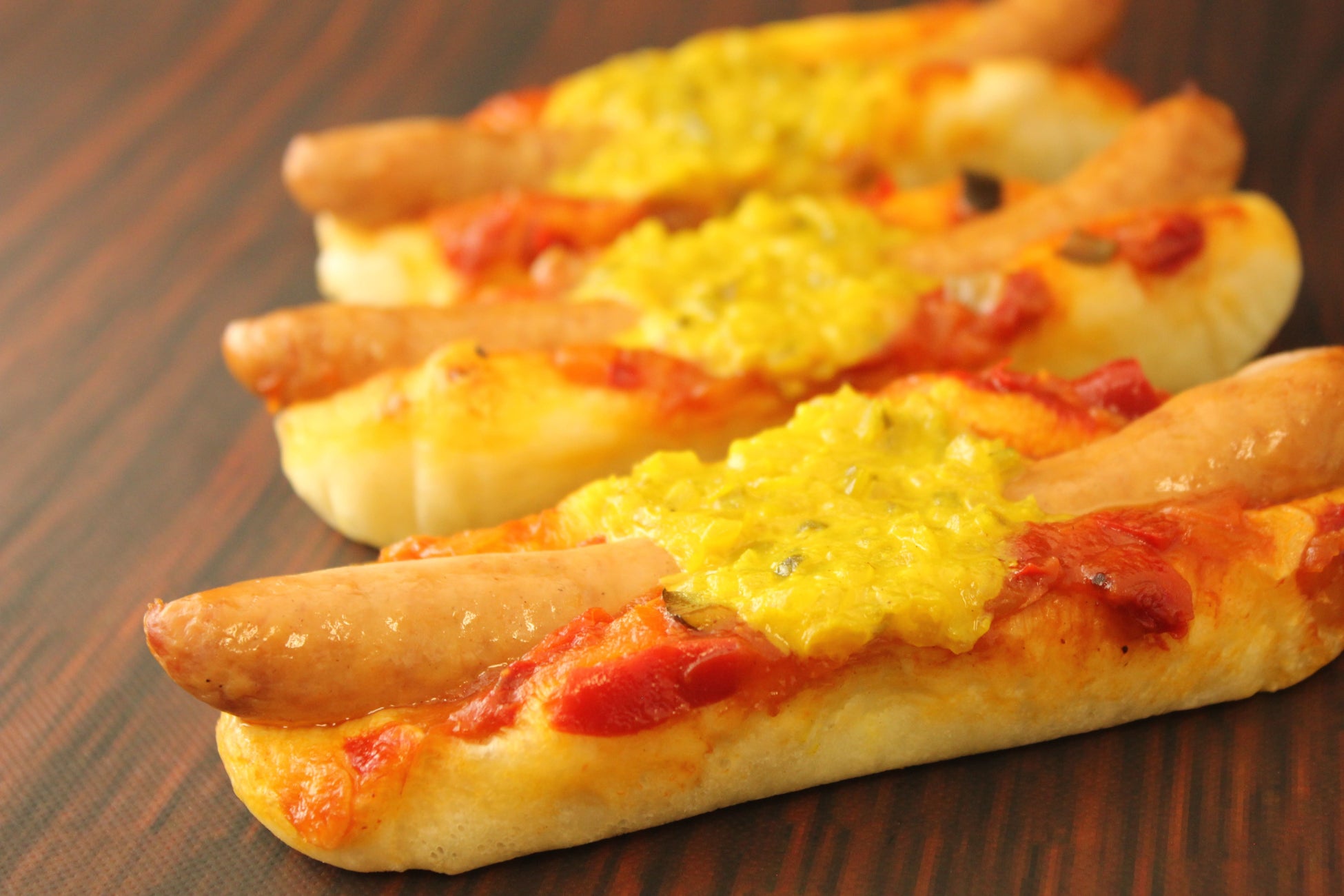 ボリュームのあるウインナーに、具沢山の野菜が入ったトマトベースのソースと、マスタードレリッシュをトッピングして焼き上げました。野菜の軽やかな酸味が、ウインナーの力強い味わいを引き立てます。
