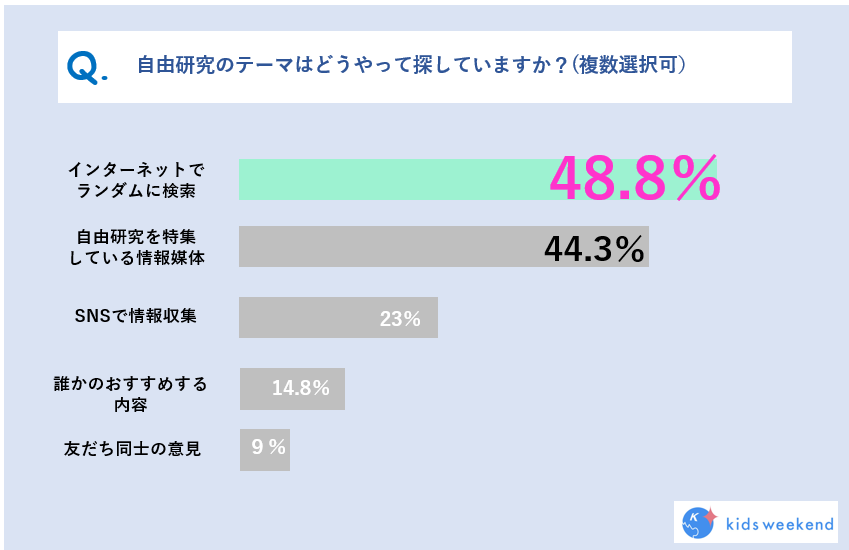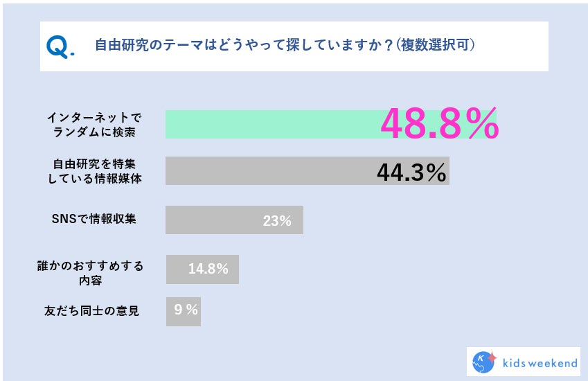 半数近くが自由研究のテーマ選びに困難を感じているなか、テーマをどうやって探しているか?については48.8%が「インターネットでランダムに検索」と回答し、44.3%が「自由研究を特集している情報媒体」と回答し、「SNSで情報収集(23%)」、「誰かのおすすめする内容(14.8%)」と続き、参考にできる情報源を求めていることが明確でした。しかしながら、自由記載でさまざなな表記ではありつつ「子どもの興味のあること」から探す、とする回答も一定数寄せられています。子どもの好きなことや興味関心の入り口を大切にしながら、自由研究についての情報を収集し、楽しんで取り組めるよう配慮をする保護者の姿が垣間見えます。