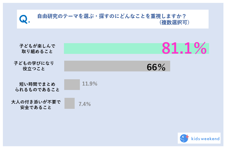 サポートは大変。でももっとも重視するのは「子どもが楽しんで取り組めること」が81.1%。自由研究は一過性ではなく、今後の継続した探究のきっかけとしたい