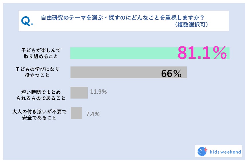 最後に、自由研究のテーマを選ぶ・探すのに重視することを尋ねると「子どもが楽しんで取り組めること」という回答が81.1%と最多となりました。次いで「子どもの学びになり、役立つこと」という回答も66%と高い数値となり、忙しい保護者にとっては長い休暇に伴走する大変さもありながら、自由研究を子どもにとって大切な機会と認識していることも推察されました。さらにこの設問における自由記載回答では、「興味の幅が拡がり次の探究につながること」や「テーマが次につながること」、「数年がかりであっても知りたいこと」、「子ども本人が普段の生活で疑問に思ったこと」といった意見が寄せられ、自由研究を一過性の宿題とはとらえず、継続した興味や探究のきっかけとなるよう考えていることがわかります。